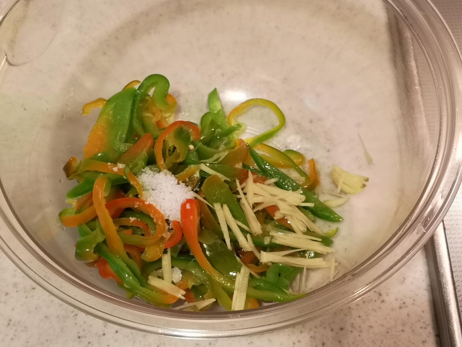 1.ピーマン(150グラム)は種を取って5ミリ幅に切り