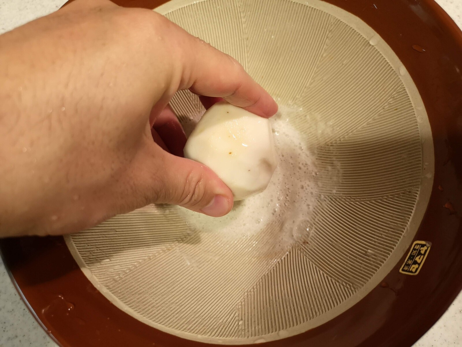 すり鉢に山芋をこすりつけて擦り下ろします