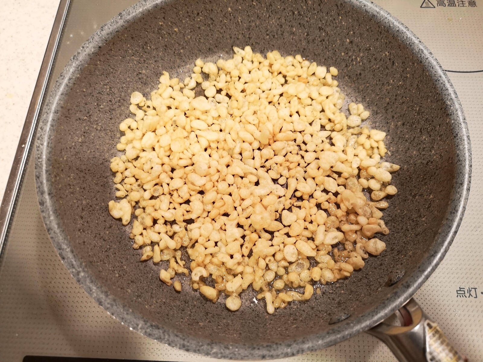 1.フライパンにサラダ油を入れて天かすを並べます