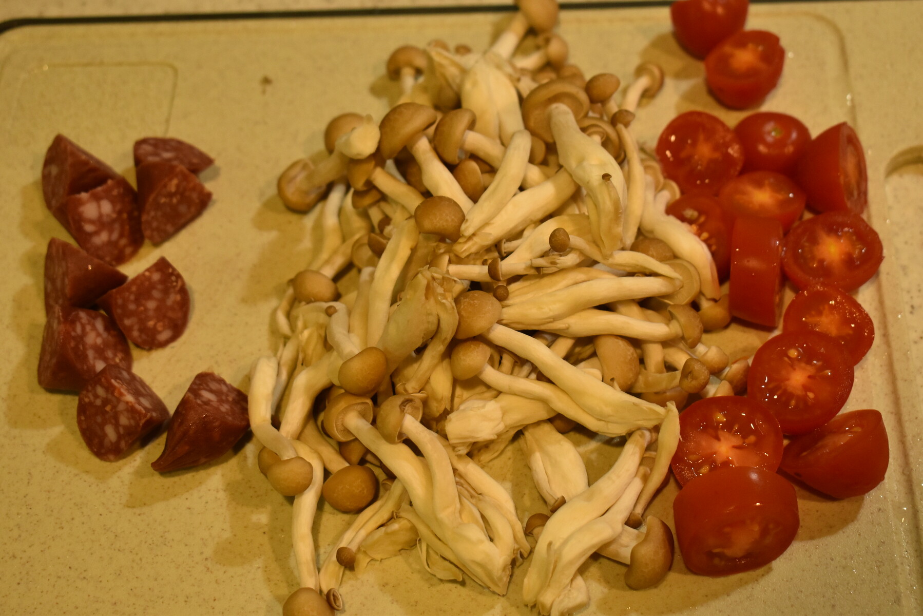 1.カルパスは乱切り、しめじは石づきを取ってばらし、ミニトマトは横半分に切っておきます