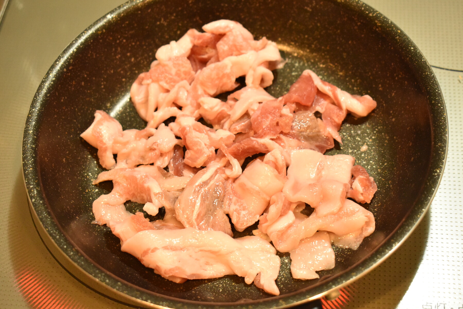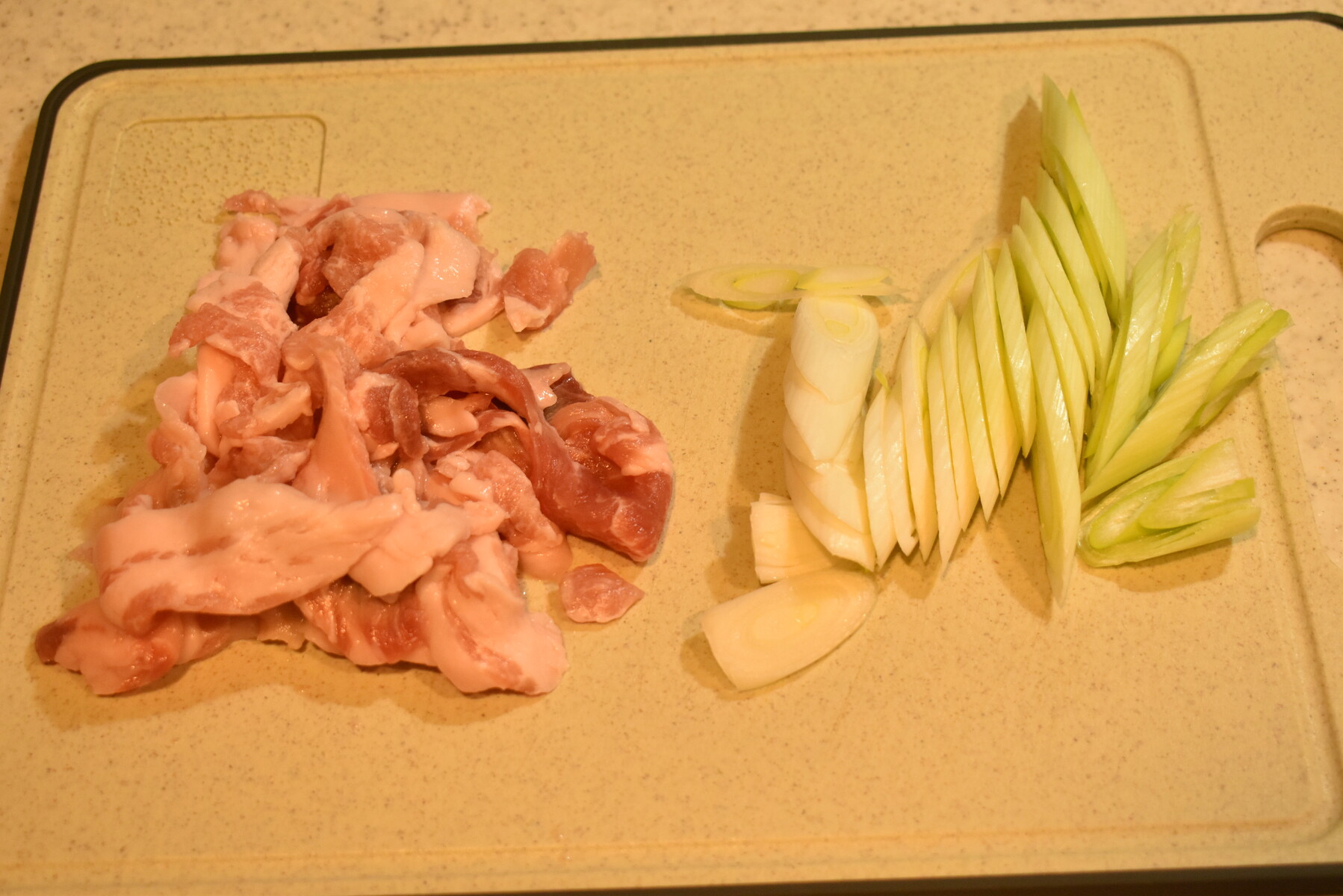 1.豚肉切り落としは一口大、白ねぎは斜め5ミリ幅に切ります
