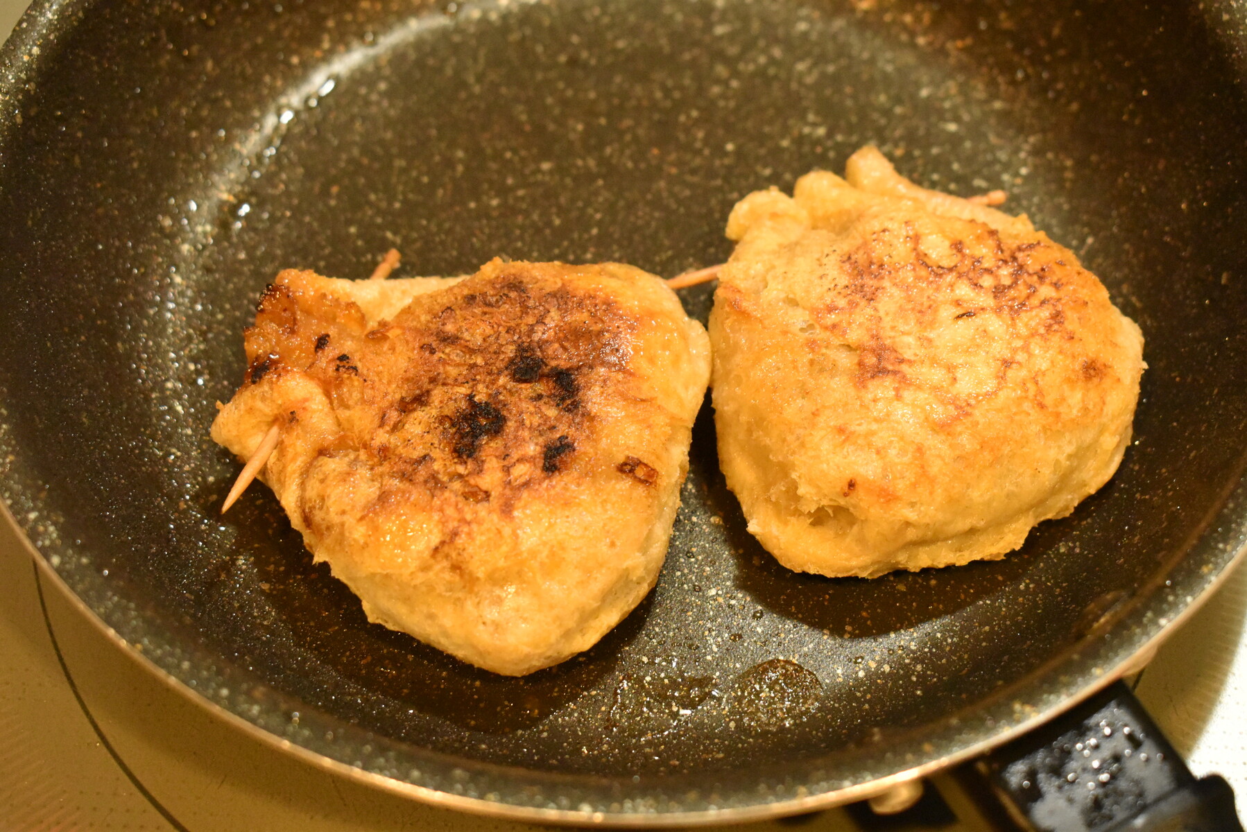 1.油揚げは半分に切って菜箸で押し付けて平らにします
