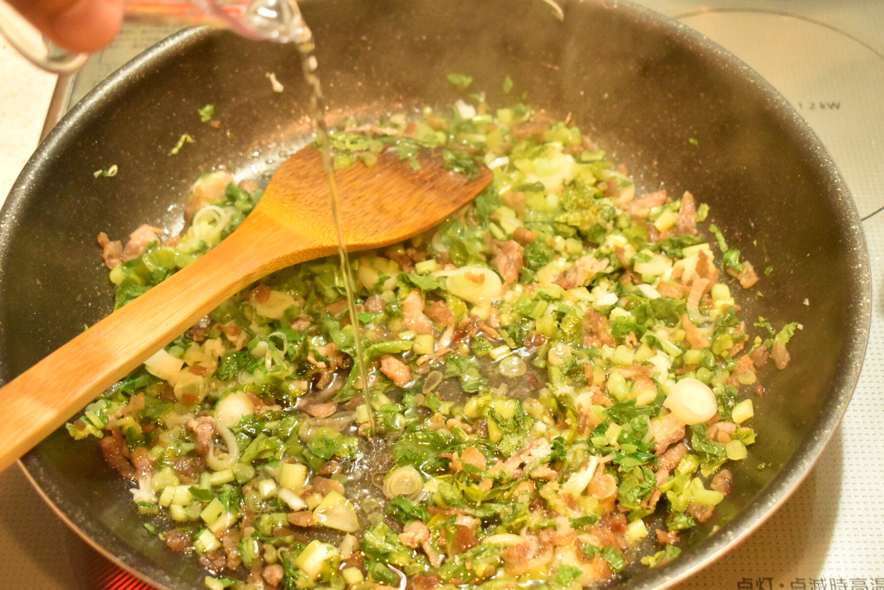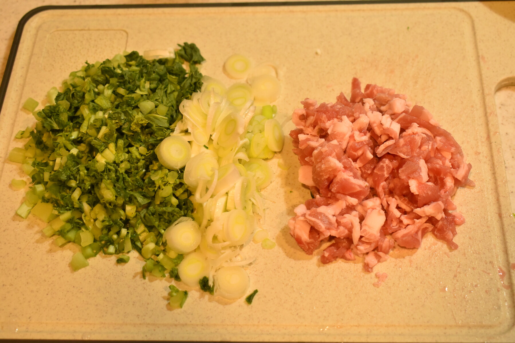 1.大根の葉は1㎝幅、白ねぎは輪切り、豚肉切り落としは荒く刻んでおきます