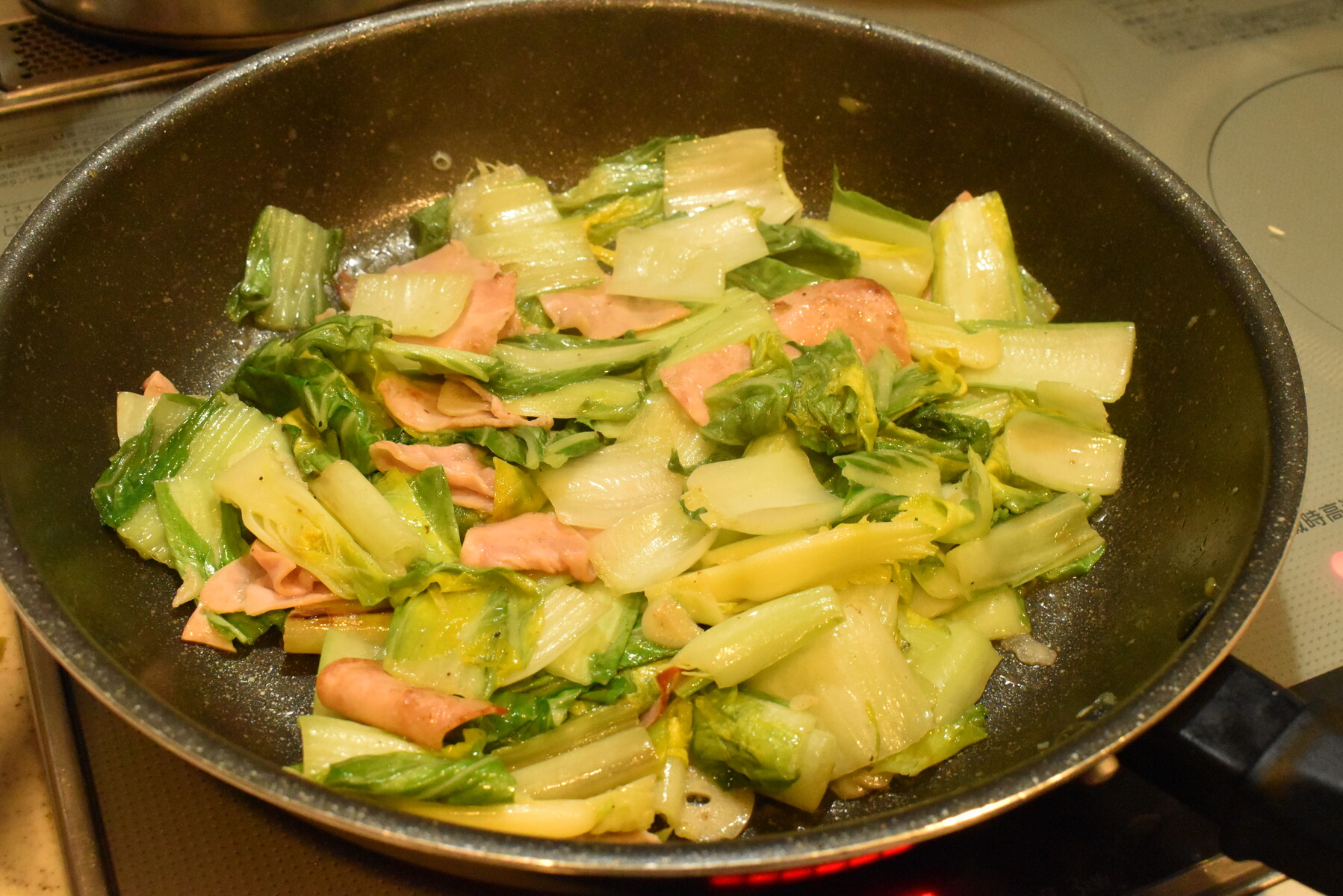 最初は白菜とハムの料のバランスがおかしいように見えますが炒めていると白菜があっという間に縮みまして(^^;