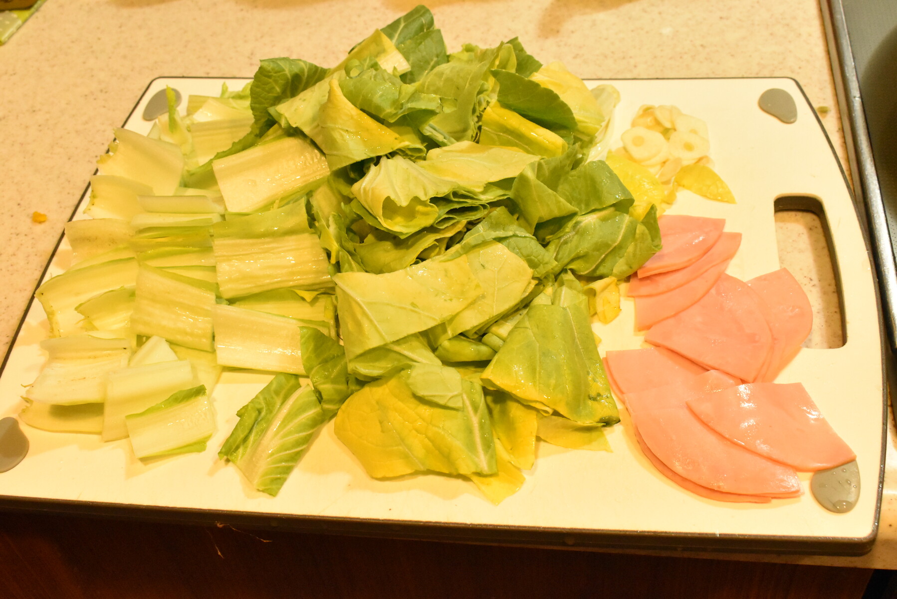 1.白菜は4㎝幅に切り、スライスハムは4等分、にんにくはスライスにしておきます