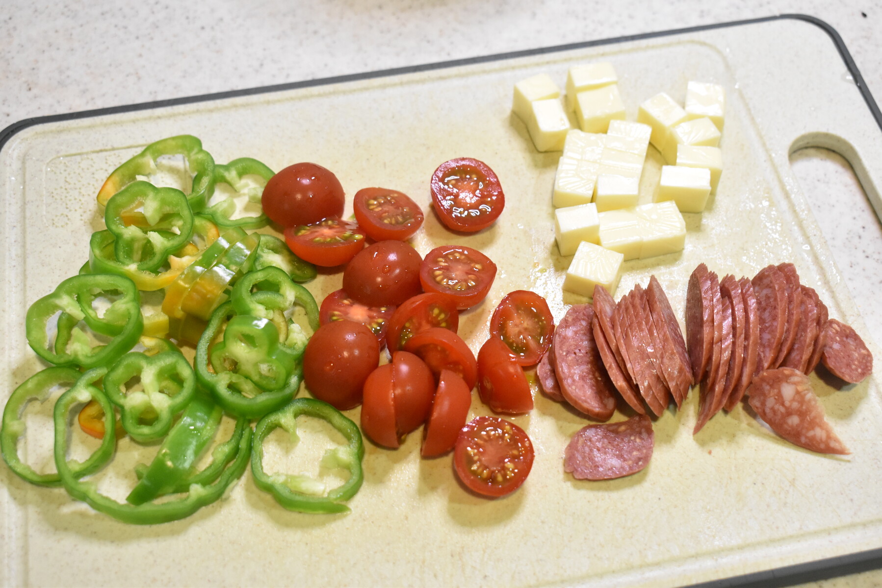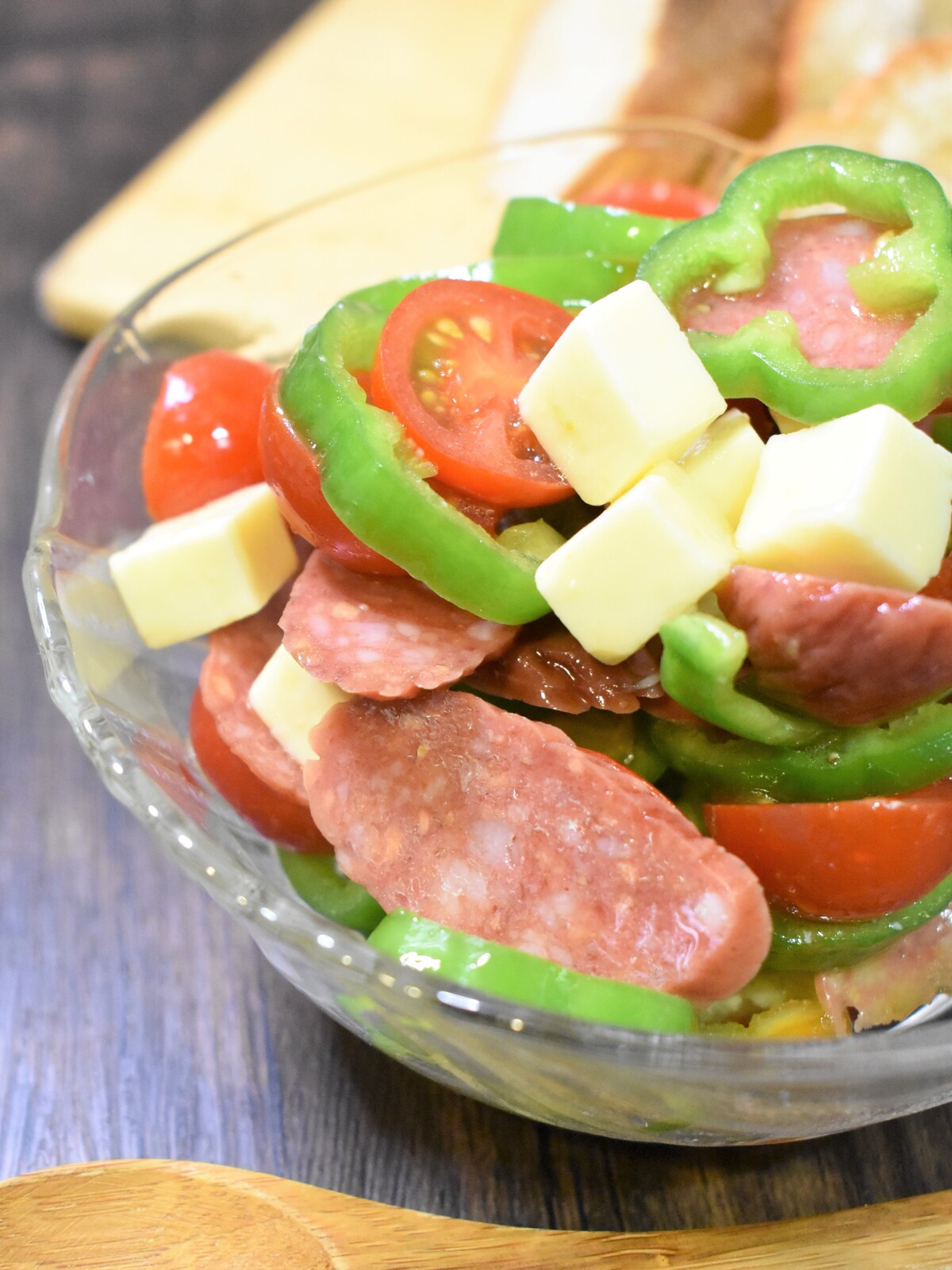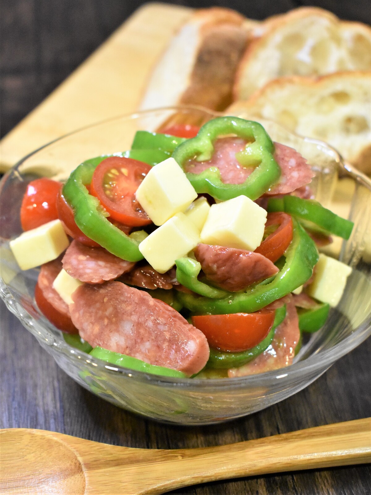 1.カルパスは斜めに薄切り、プロセスチーズは1㎝角