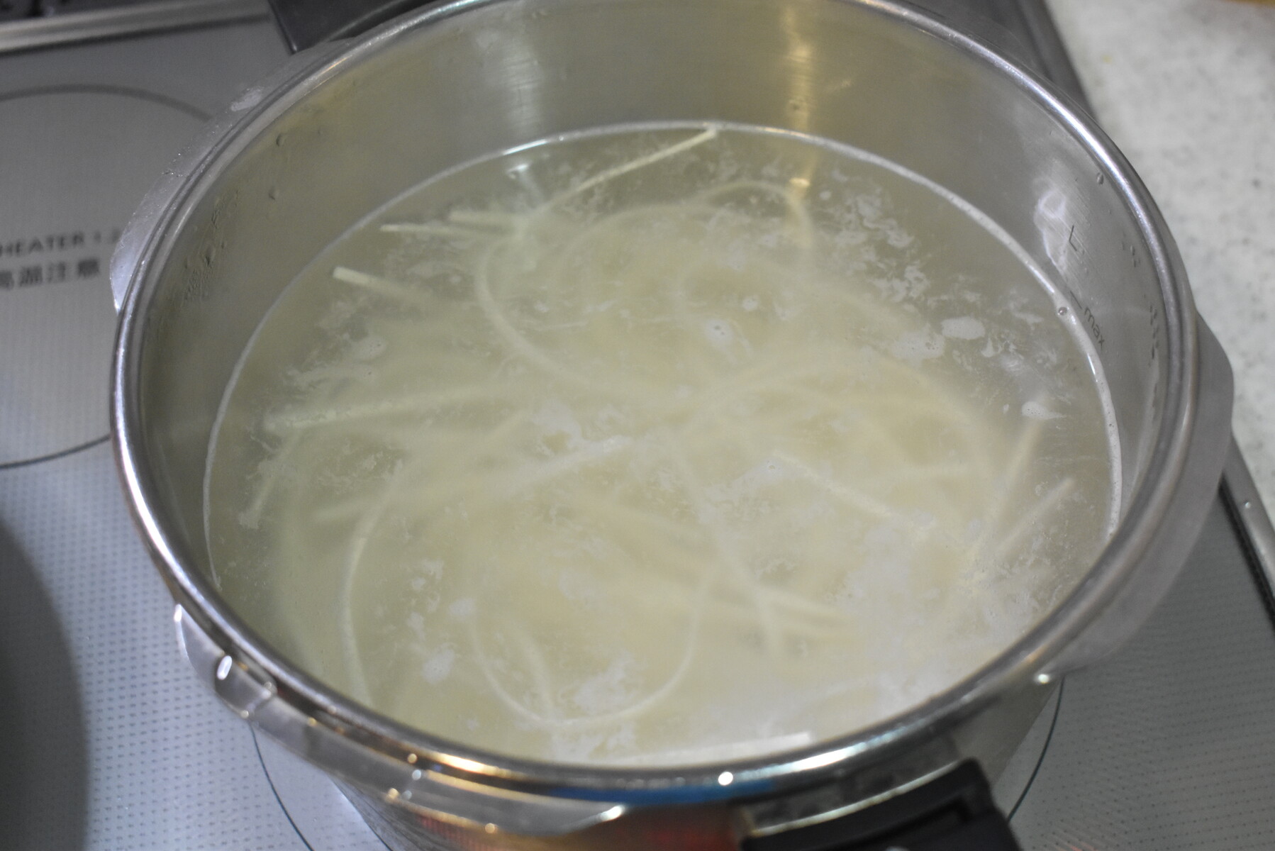 1.鍋にお湯を沸かして乾燥うどんを指定の時間茹でる