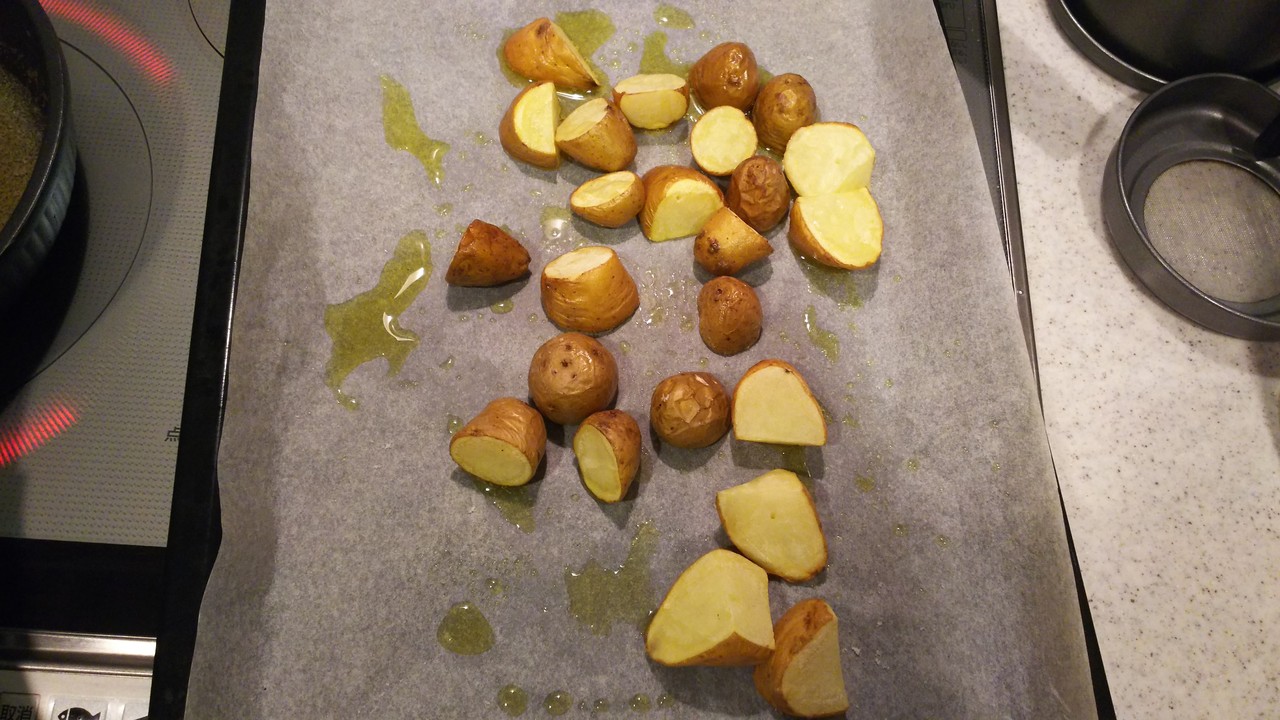 2.オーブン皿にオーブンシートをひいてジャガイモを並べて塩(少々)をふりオリーブオイル(適量)をかけます