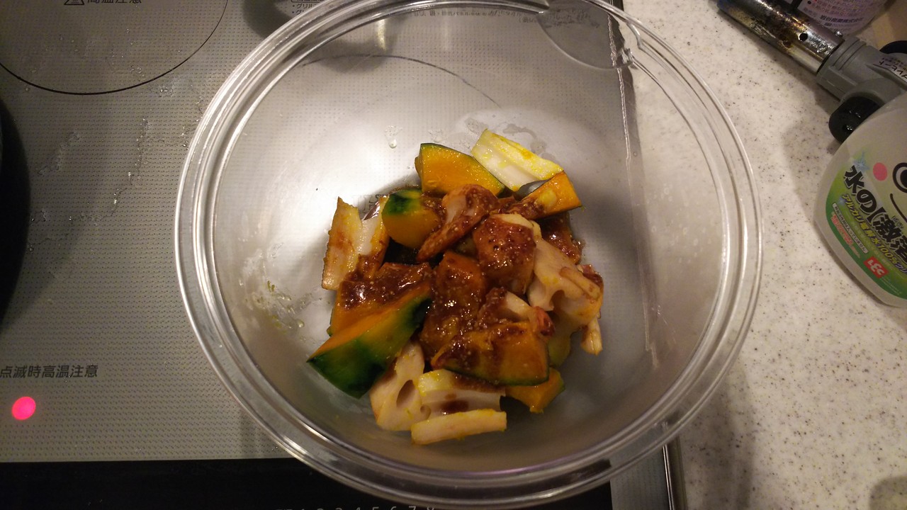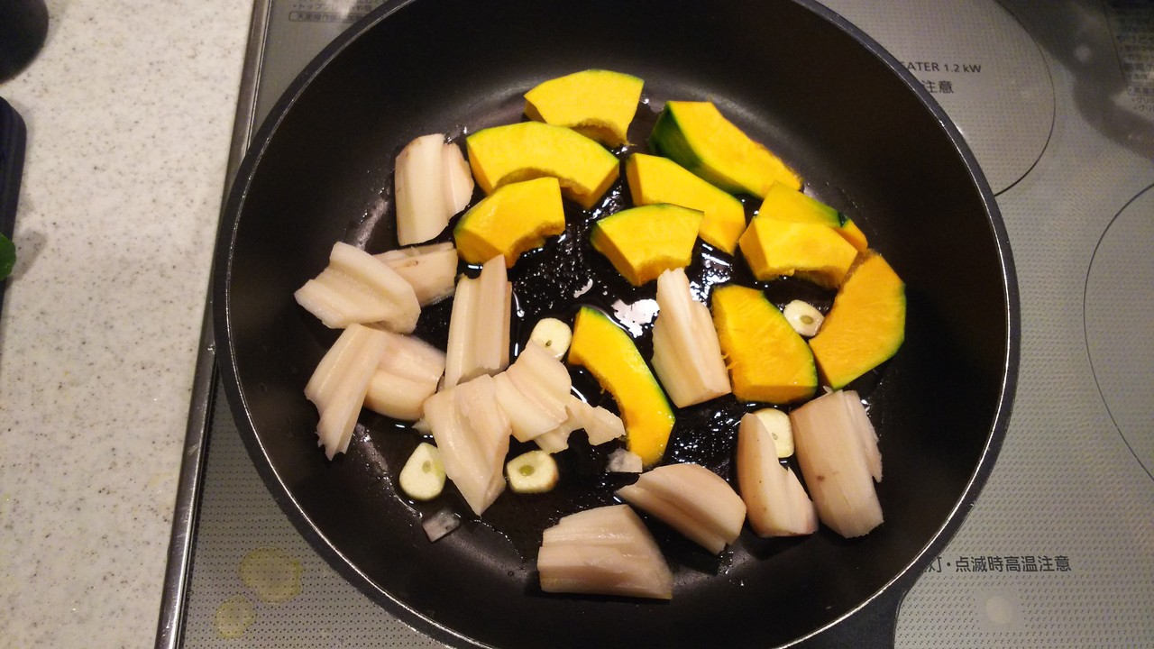 1.カボチャ(200グラム)、蓮根(150グラム)は一口大より少し大きめに