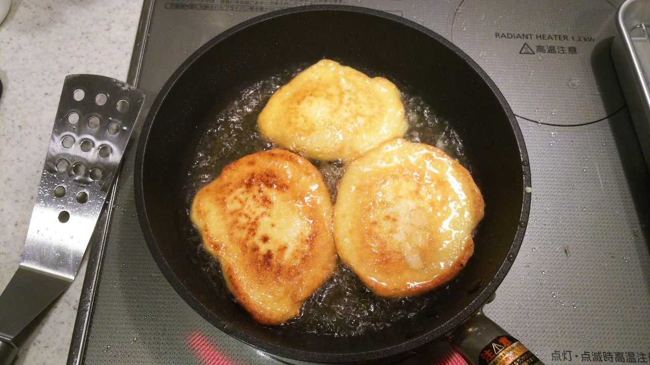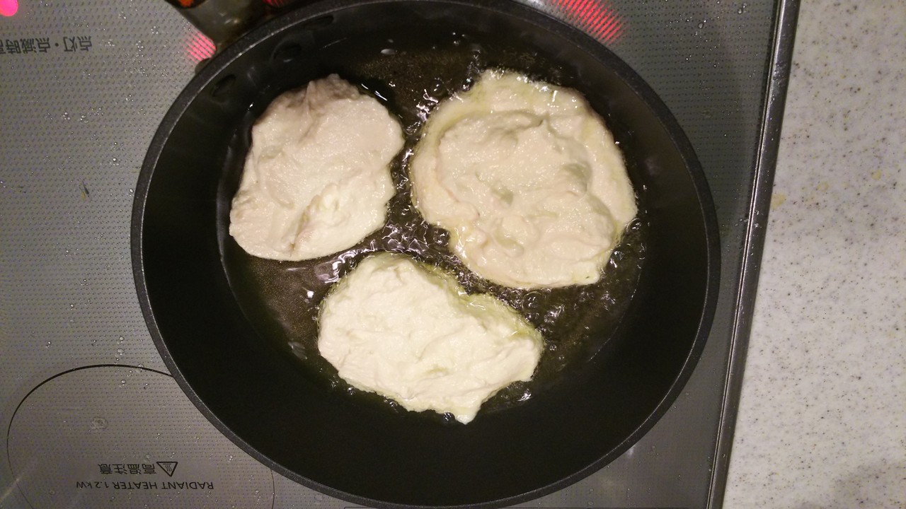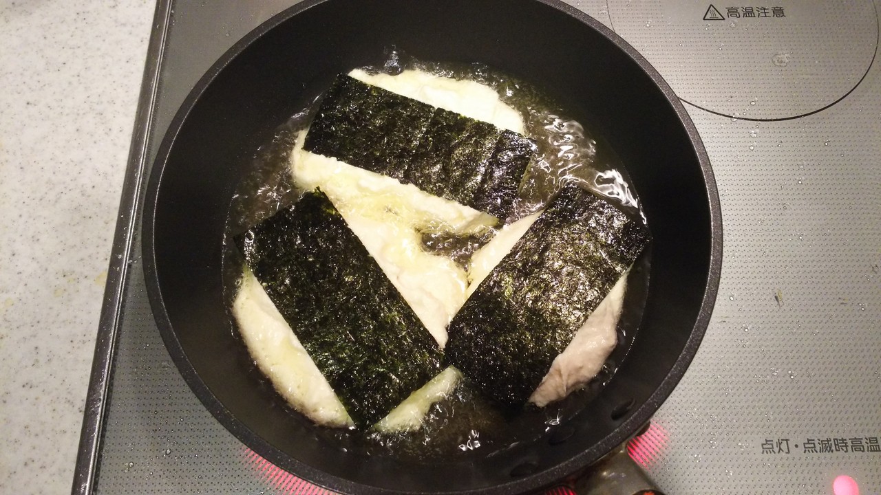 玉子と一緒に撹拌して海苔をのせて揚げ焼きに