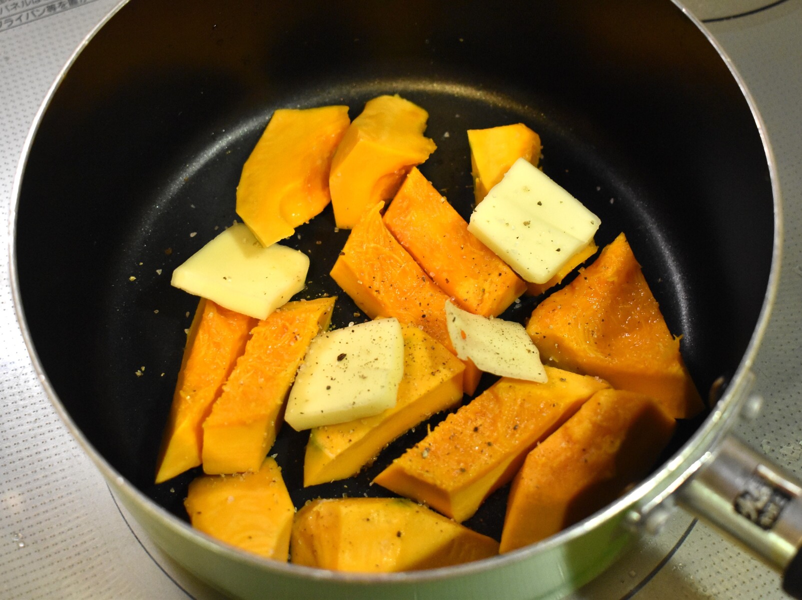 1.鍋に皮と種を取って乱切りにしたカボチャ、【A】を入れて蓋をして弱火で8分火にかけます