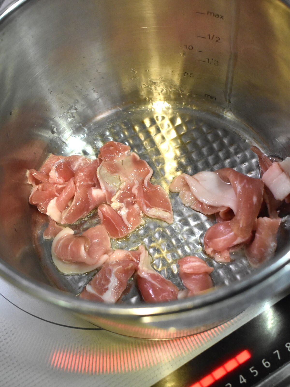 1.鍋にサラダ油を入れて豚肉切り落としを炒めます