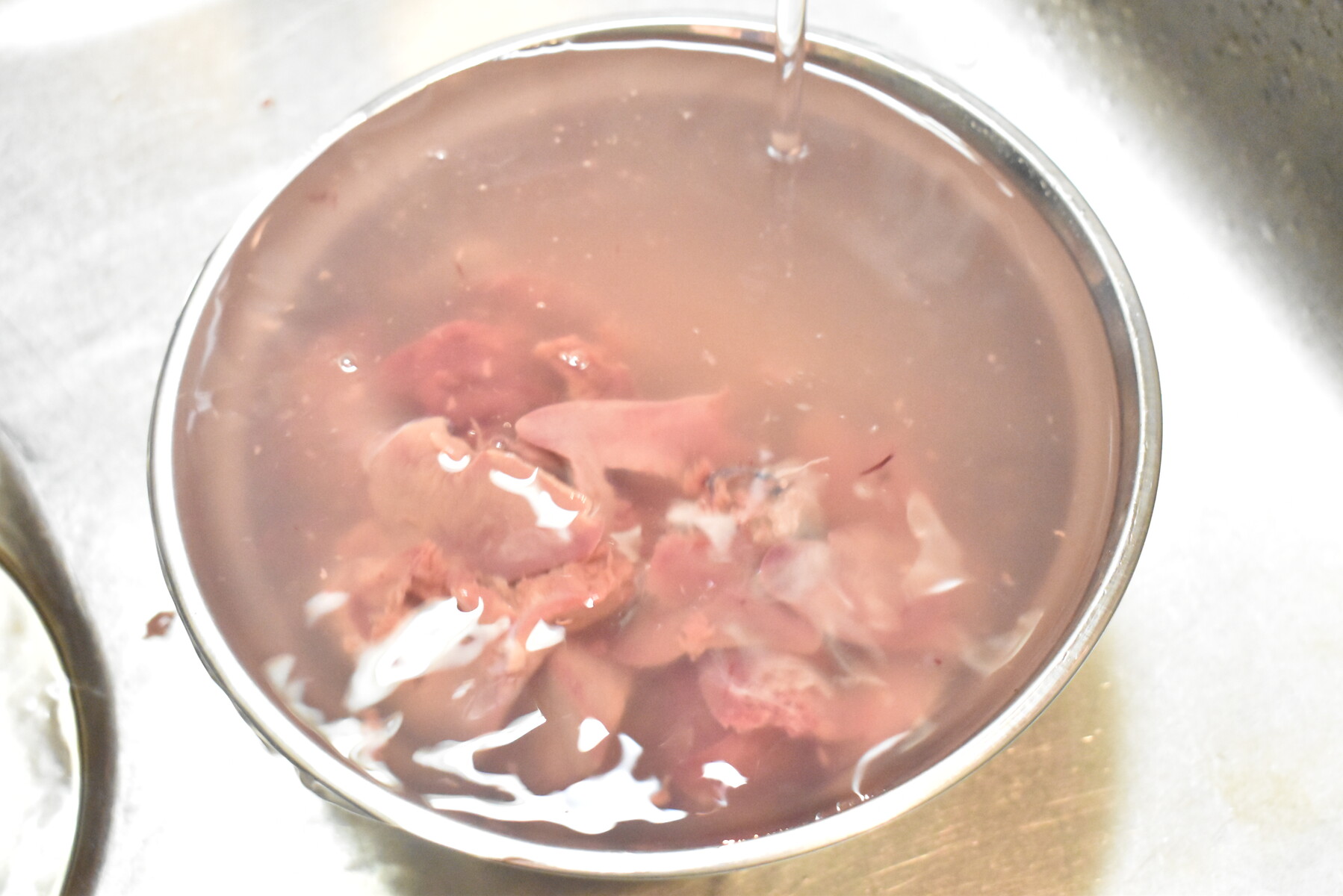 1.鶏レバーは筋と血の塊りを取って流水で洗います