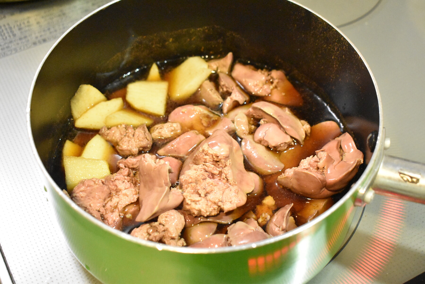 3.別の鍋に取り出した鶏レバー、5ミリ幅に切ったリンゴ、【A】を入れて中火にかけます