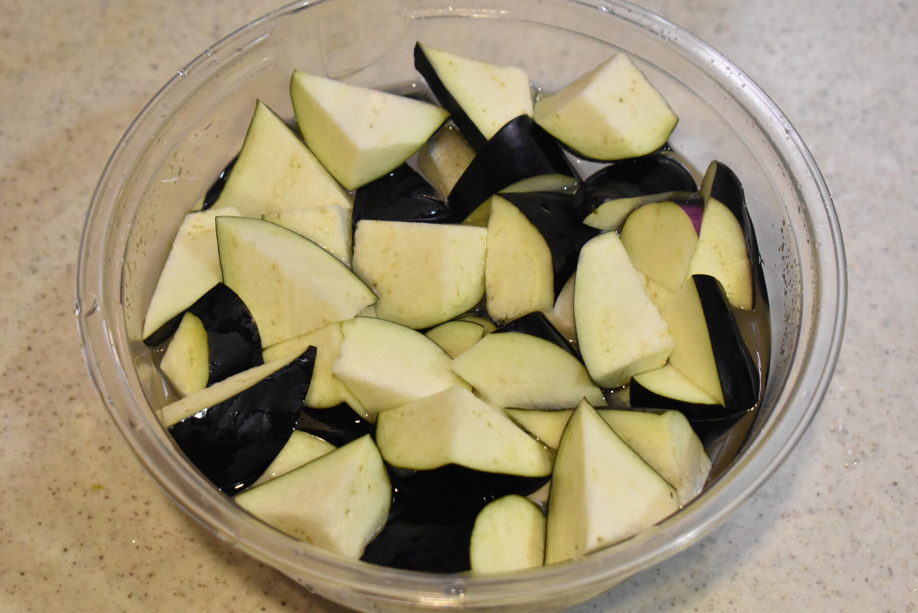 1.茄子はヘタを落として乱切りにして水に漬けます