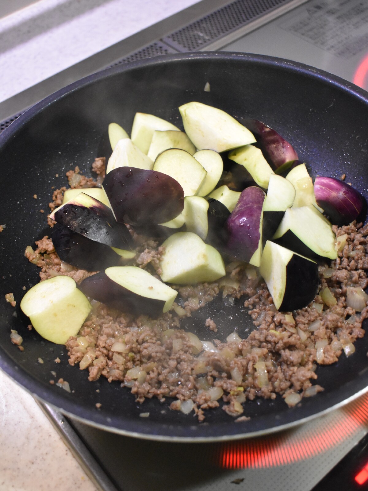 茄子は最初に炒めるときに多少は焼いていますが皮がまだ硬かったりするので