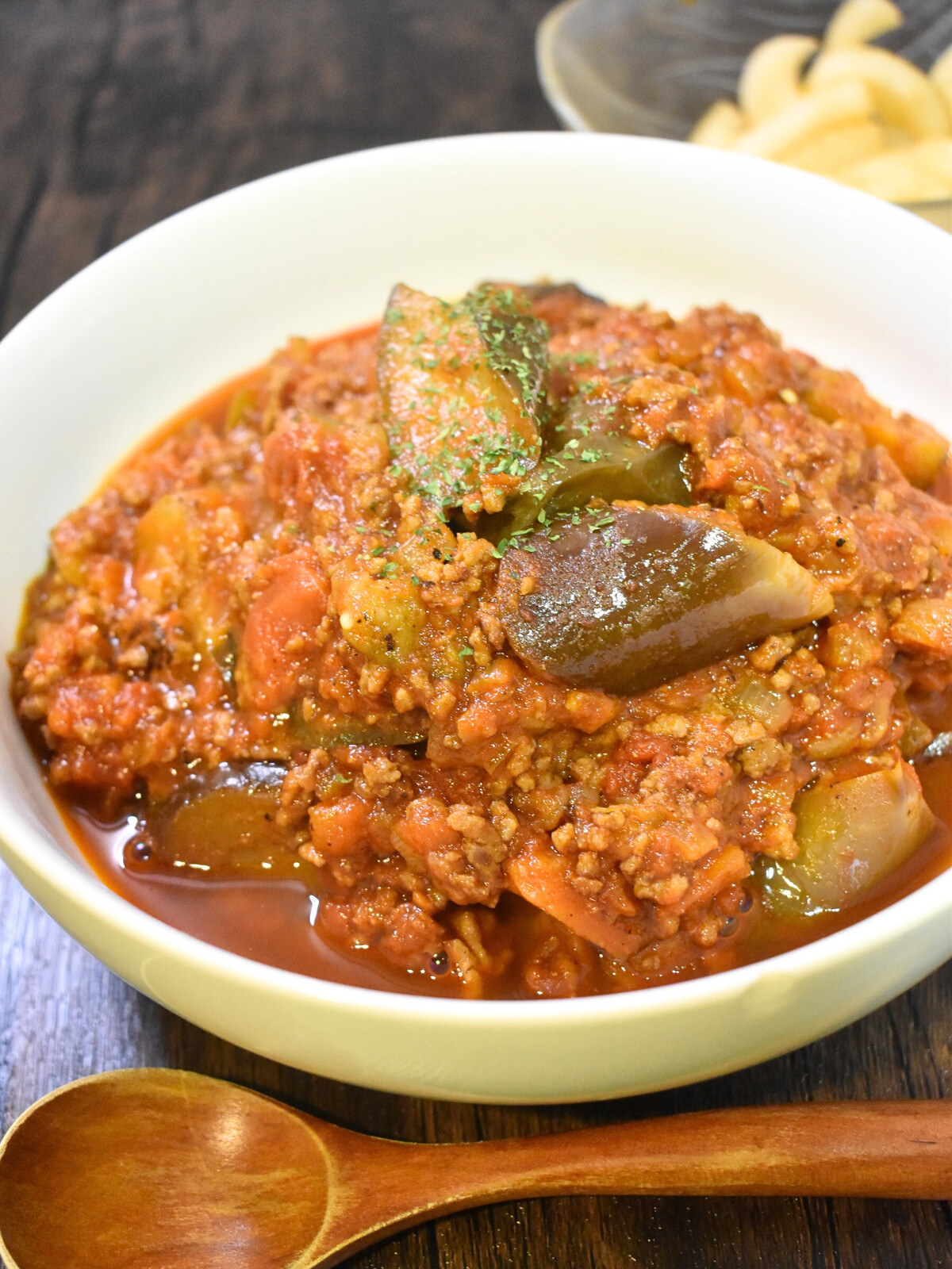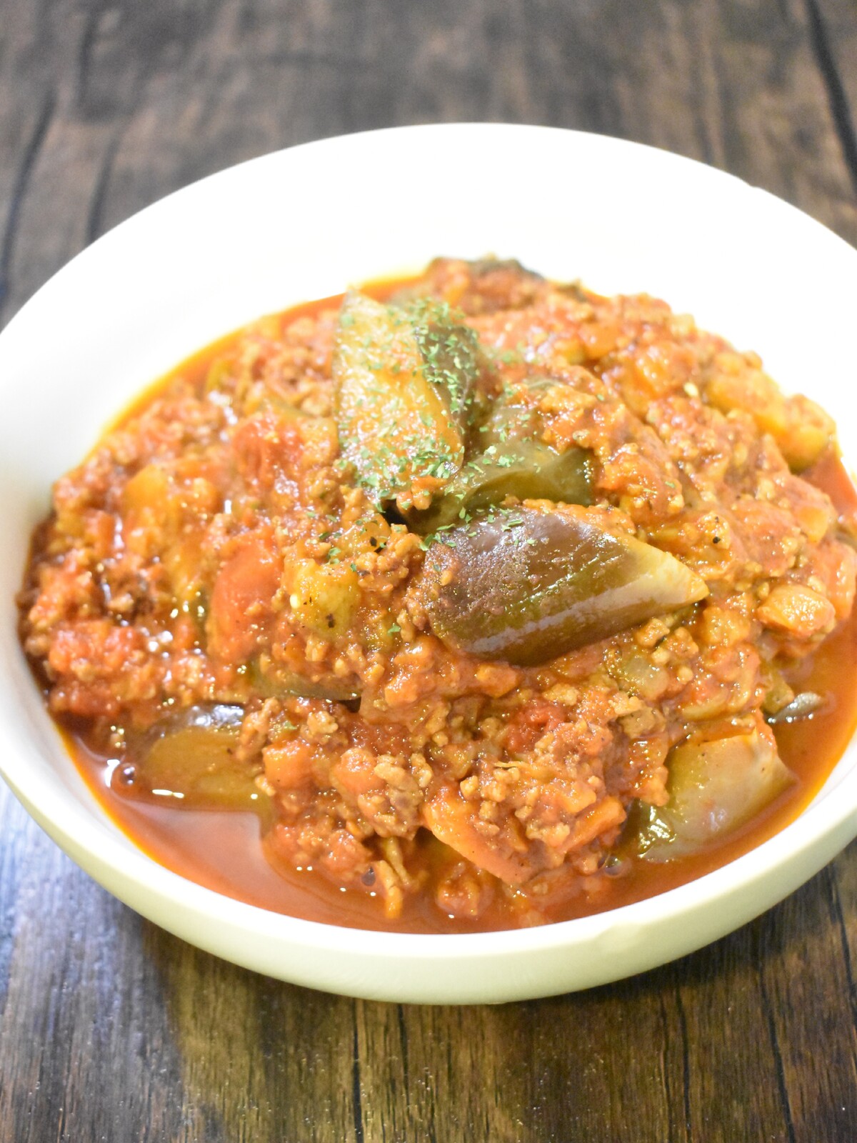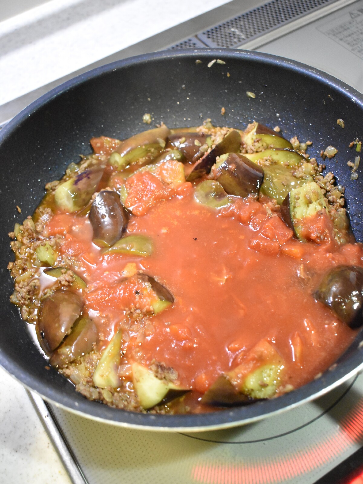 ひき肉の脂がよく茄子と絡んで、そこにトマトの酸味でさっぱりと頂けます👍