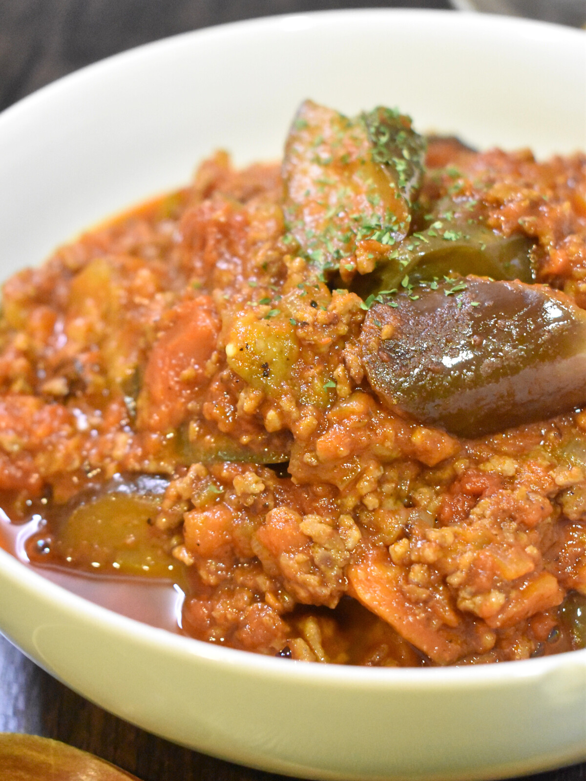 割と定番な感じではありますがひき肉とトマトで煮込みました。