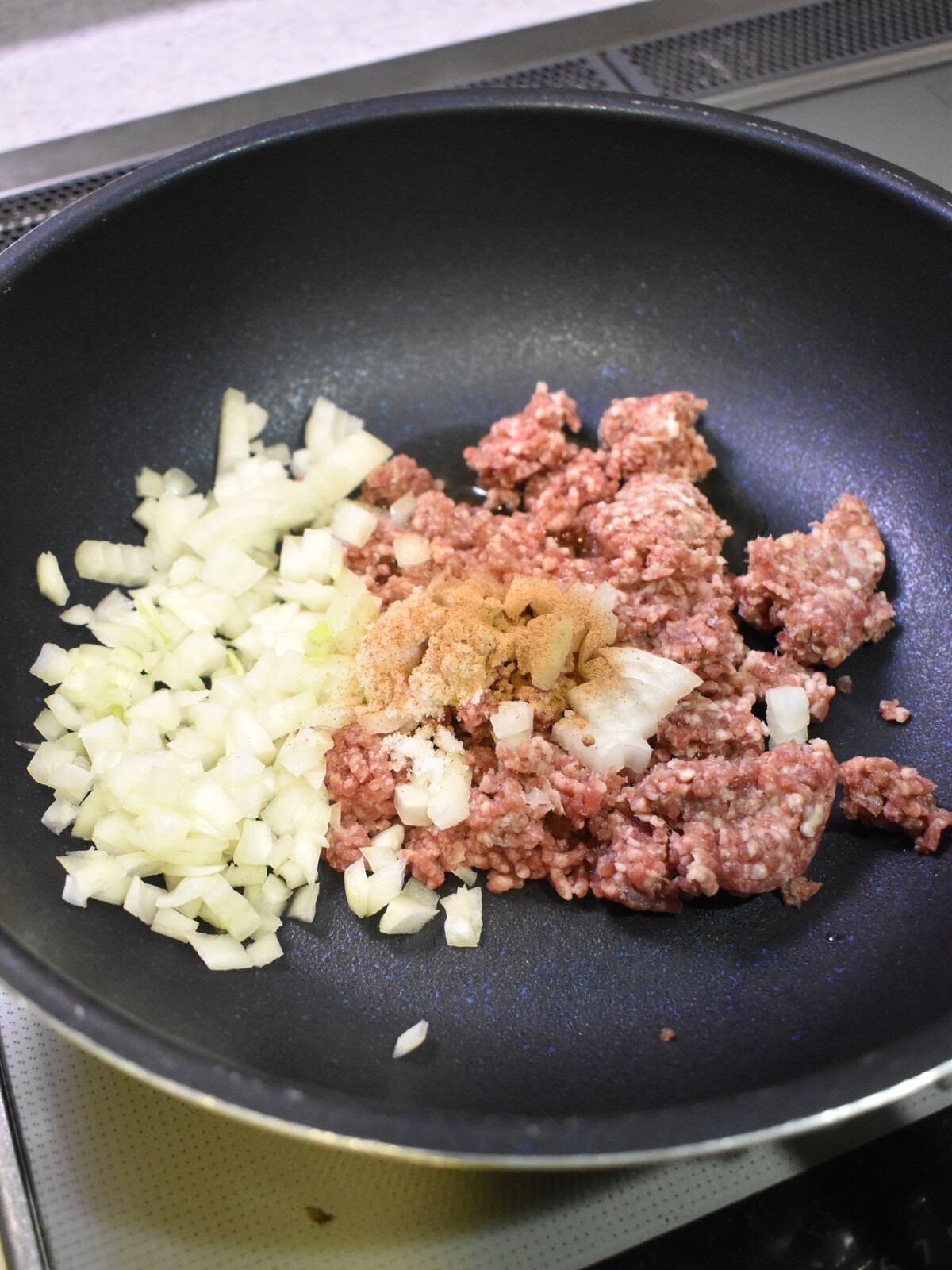 1.フライパンにサラダ油、合いびき肉、粗みじんにした玉ねぎ、【A】を入れて炒めます