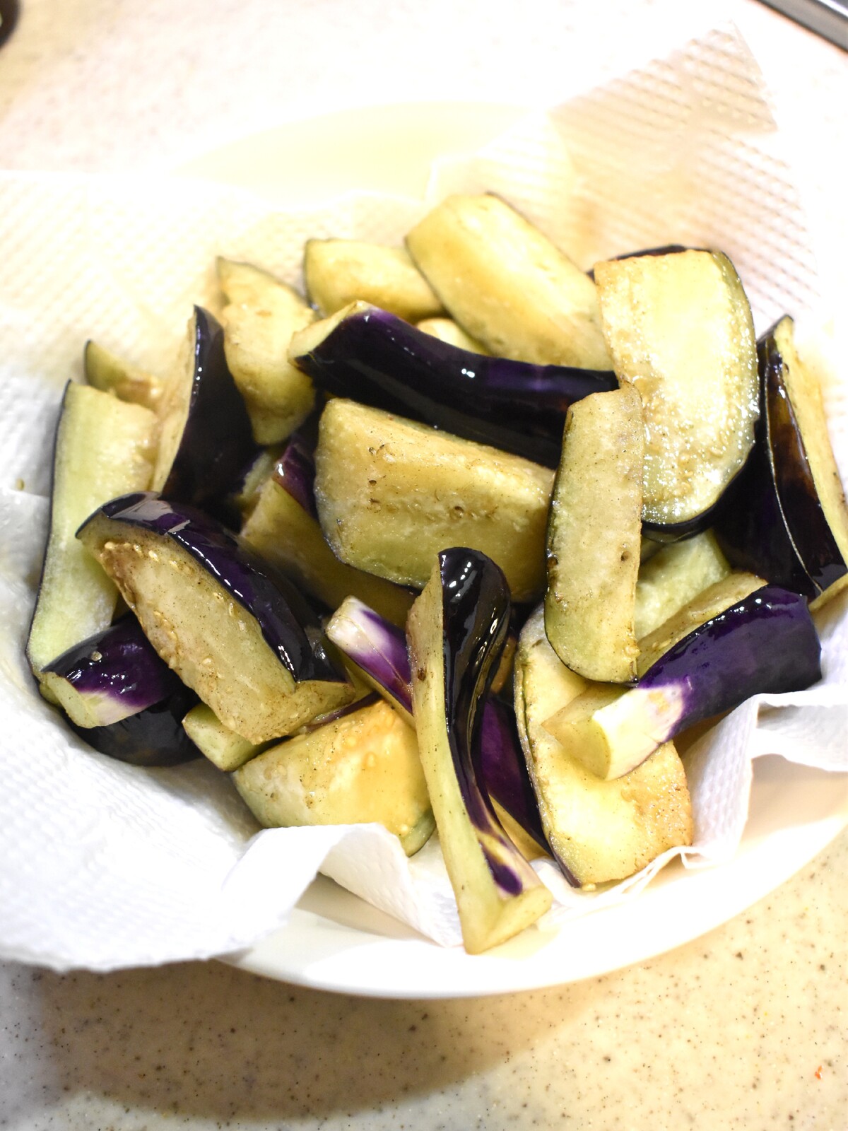 1.茄子は横半分に切って縦4~6等分にしたら油で揚げます
