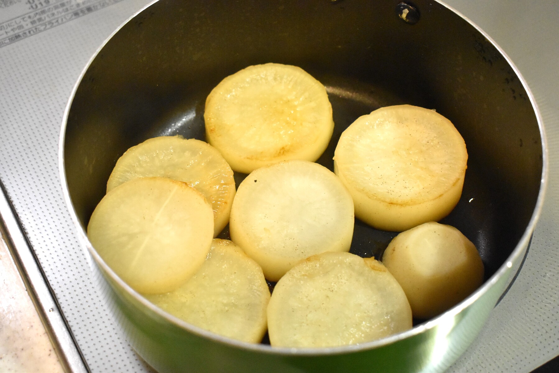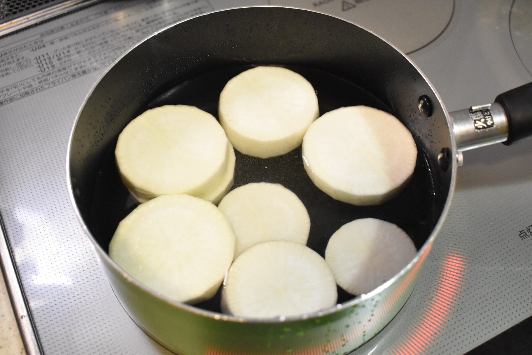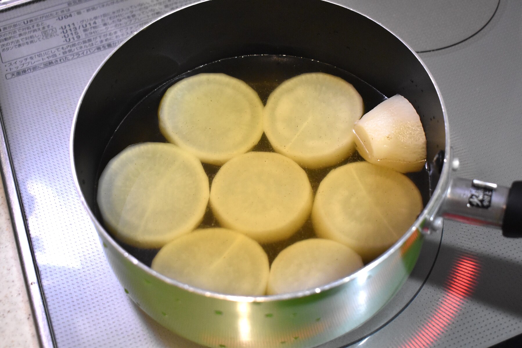 1.鍋に水と皮を剥いて2㎝幅に切った大根を入れて20分煮ます