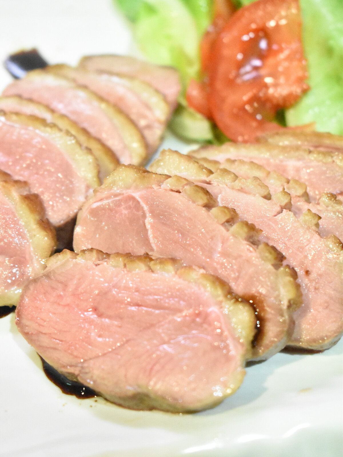 7.鴨は1㎝幅に切ってトマト、レタスを添えたお皿に盛って6のソースをかけます