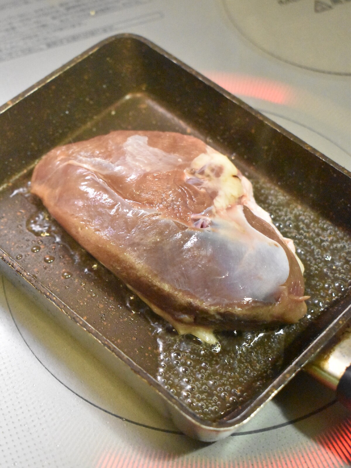 4.皮の部分がカリっとなるまで焼けたらひっくり返して弱火で5分焼きます