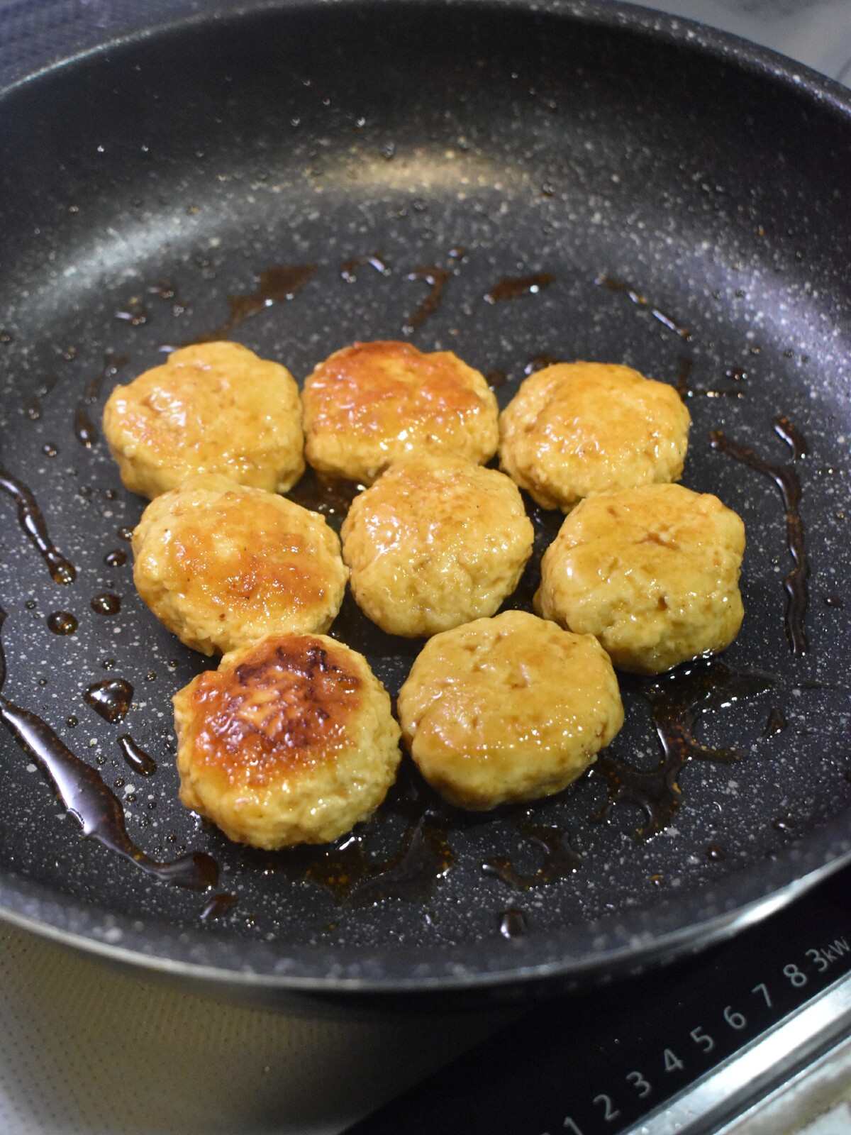 3.麩ラパンにサラダ油をひいて一口大に丸めた鶏ひき肉を焼きます