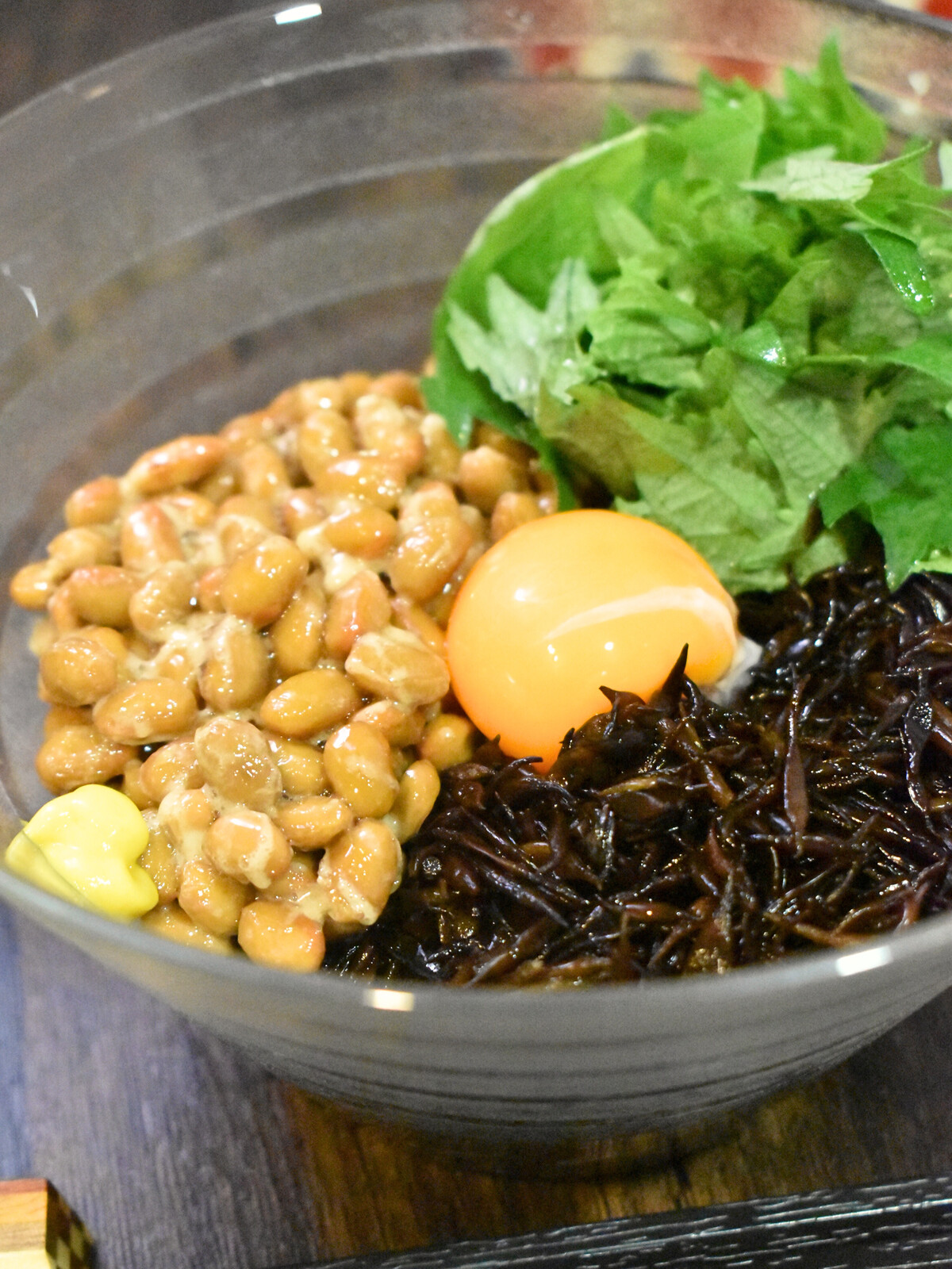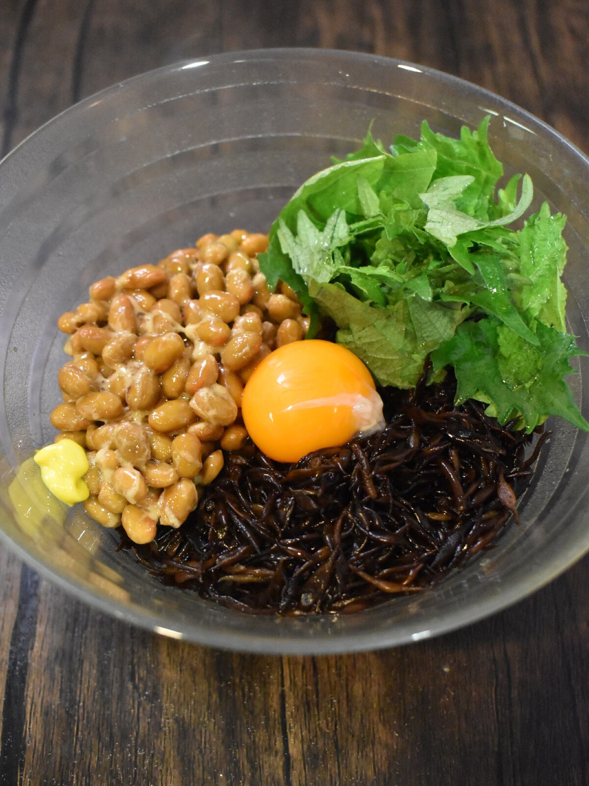 2.器にひじき、納豆、ざく切りにした紫蘇、卵黄を入れて【A】をかけます