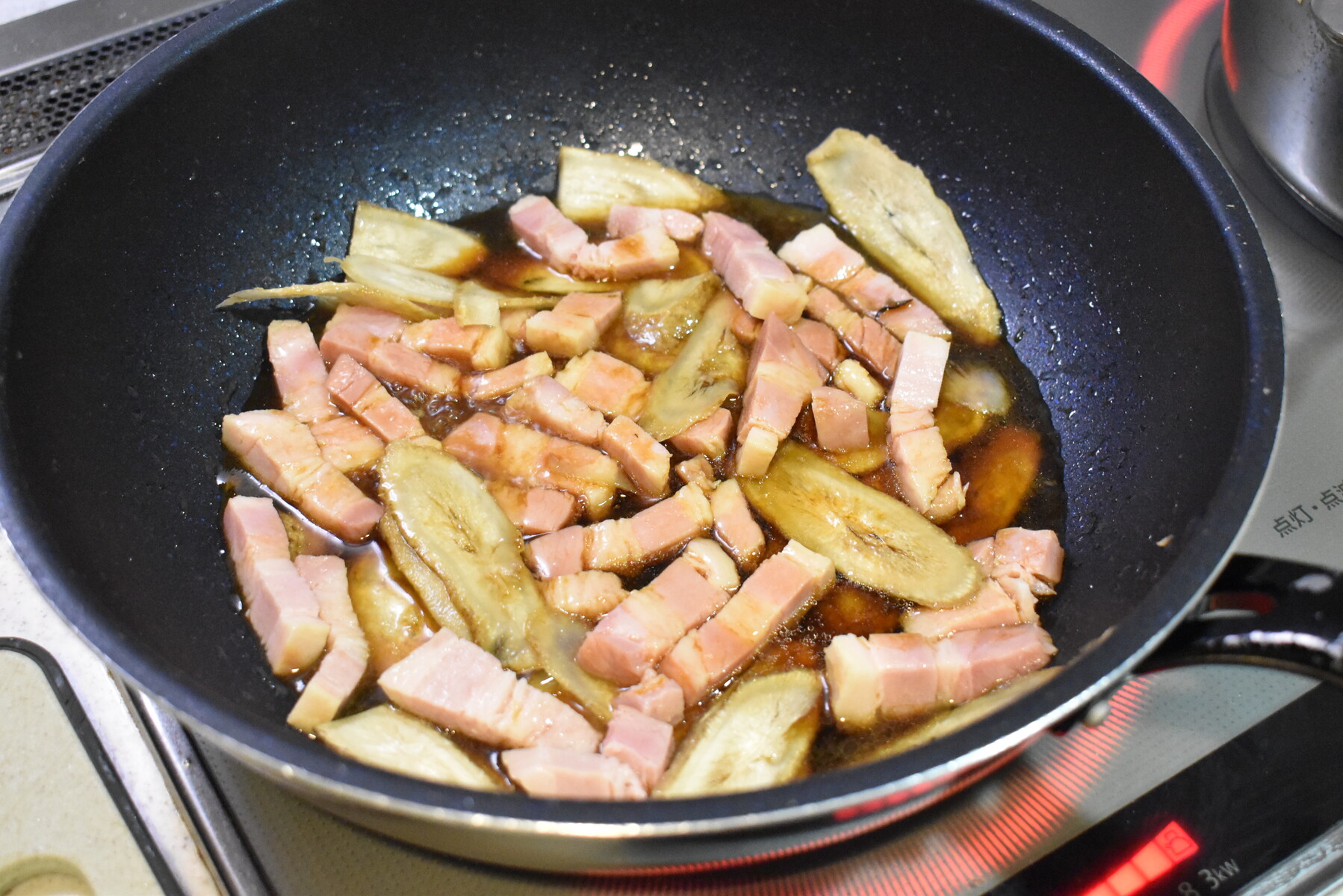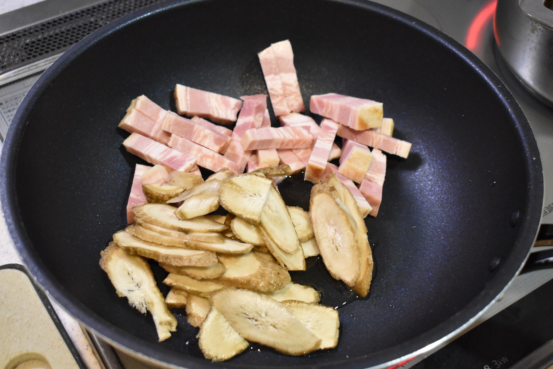 2.フライパンにサラダ油、短冊切りにしたベーコン、斜め薄切りにしたごぼうを入れて炒めます