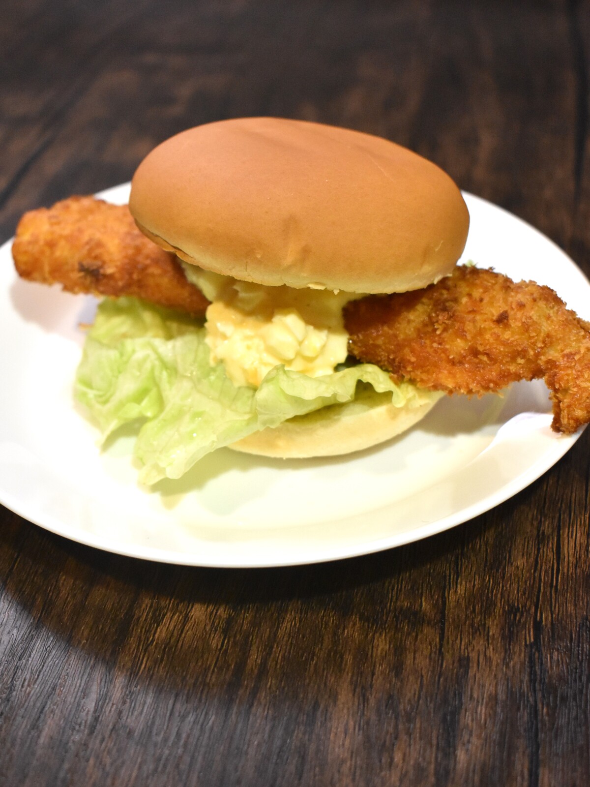 7.バンズ(下)、レタス、カツ、タルタルソース、バンズ(上)の順に重ねます