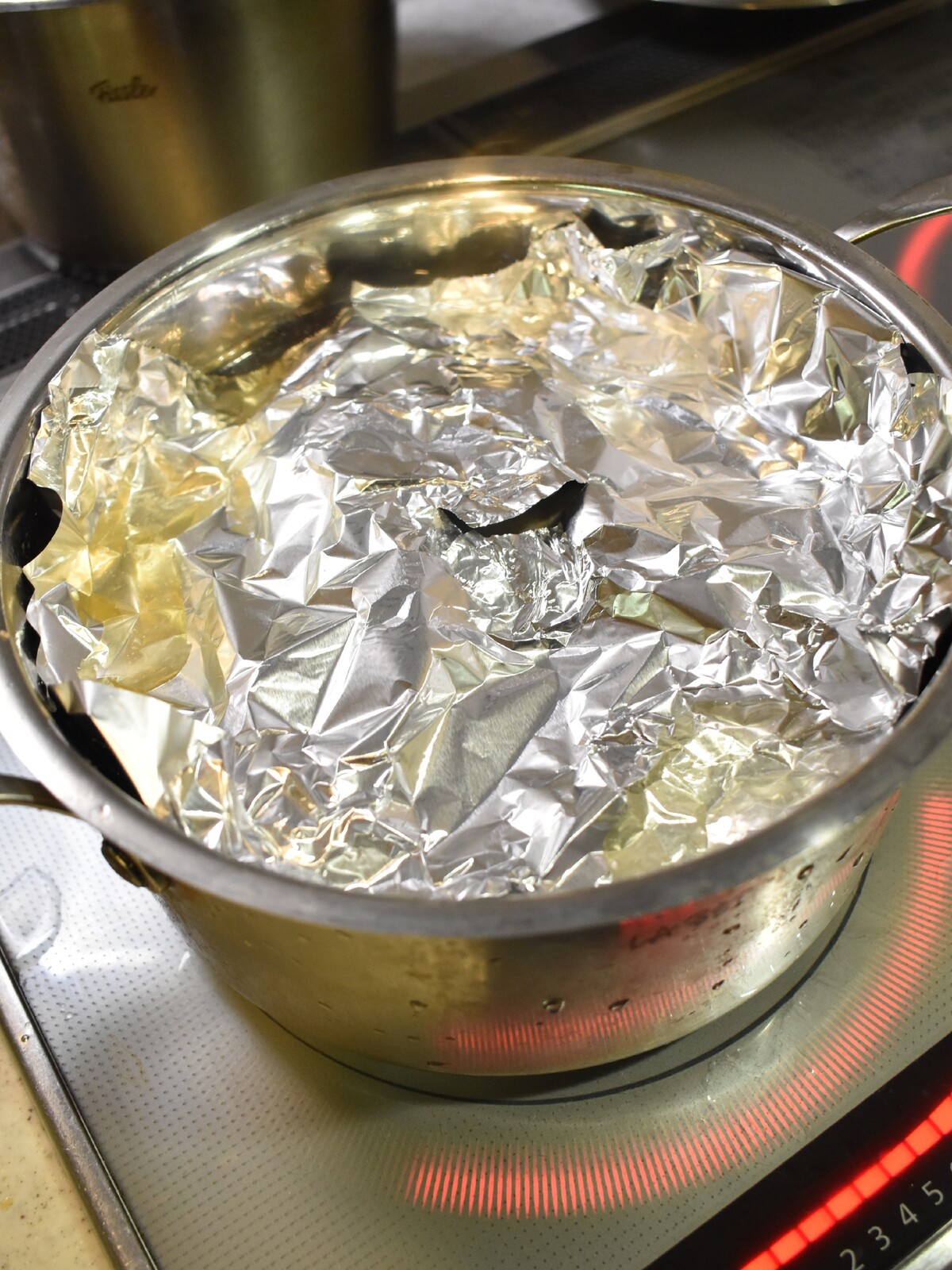 5.アルミホイルで落し蓋をしてさらに蓋をして弱火で2時間煮ます