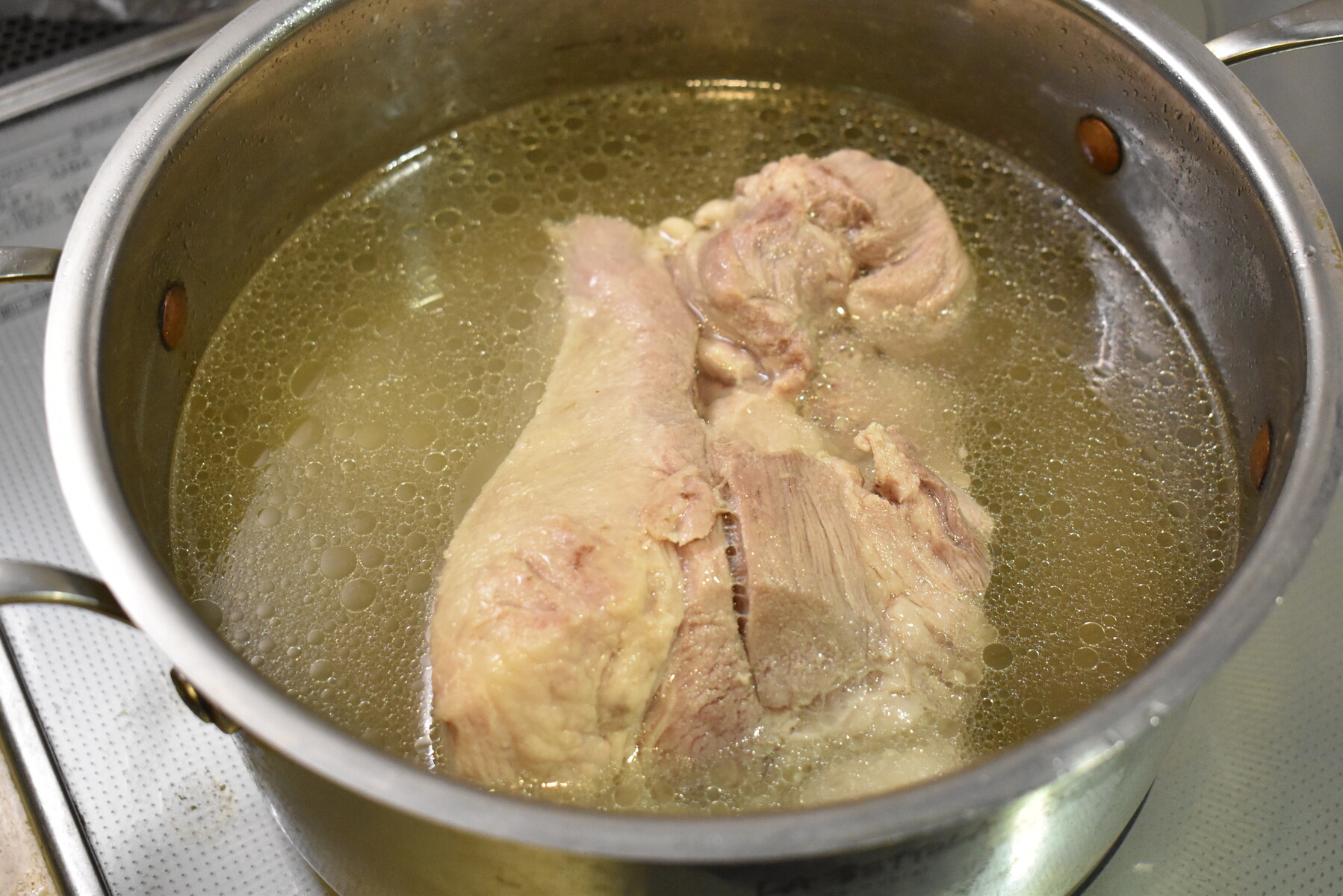 1.鍋に豚肩ロース塊、白ねぎ、薄切りにした生姜、水を入れて火にかけます