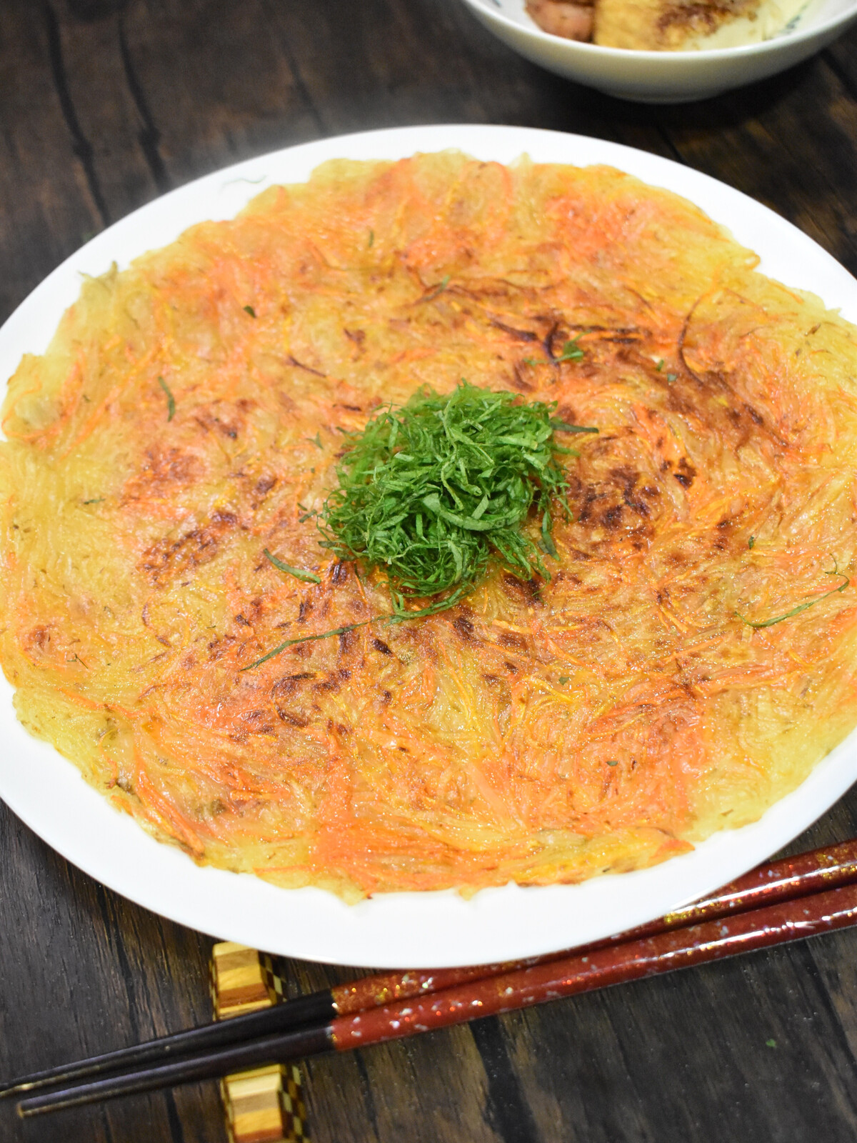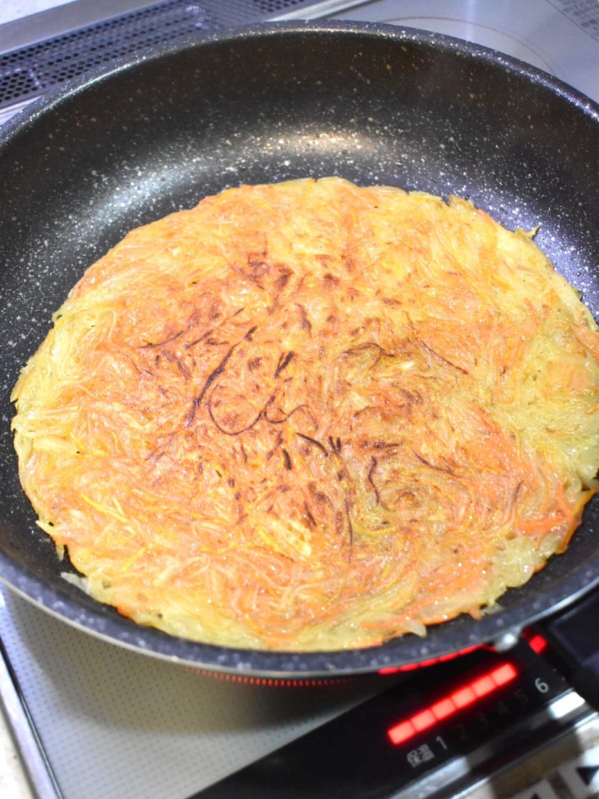 2.フライパンにサラダ油をしいて1を薄く広げて押さえながら弱火で焼きます