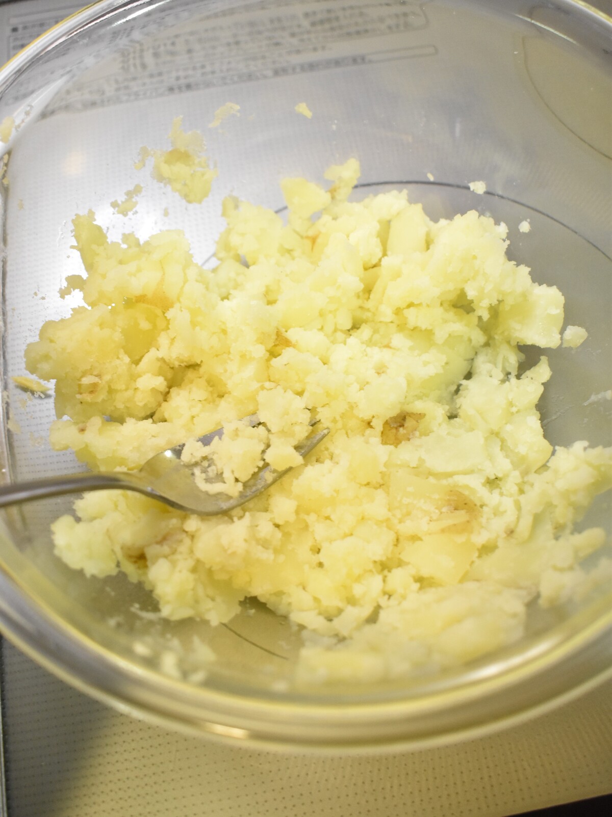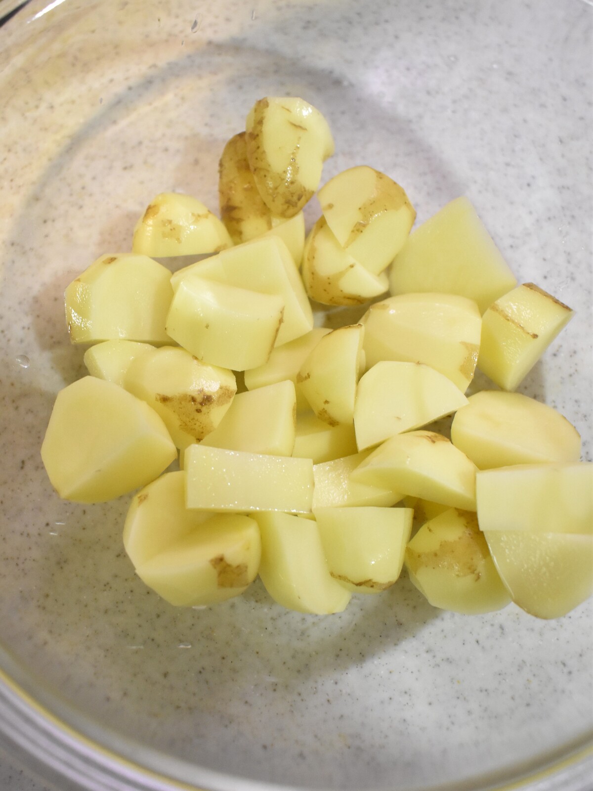1.じゃがいもは皮を剥いて一口大に切ったら耐熱ボウルに入れて500Wのレンジに7分かけます