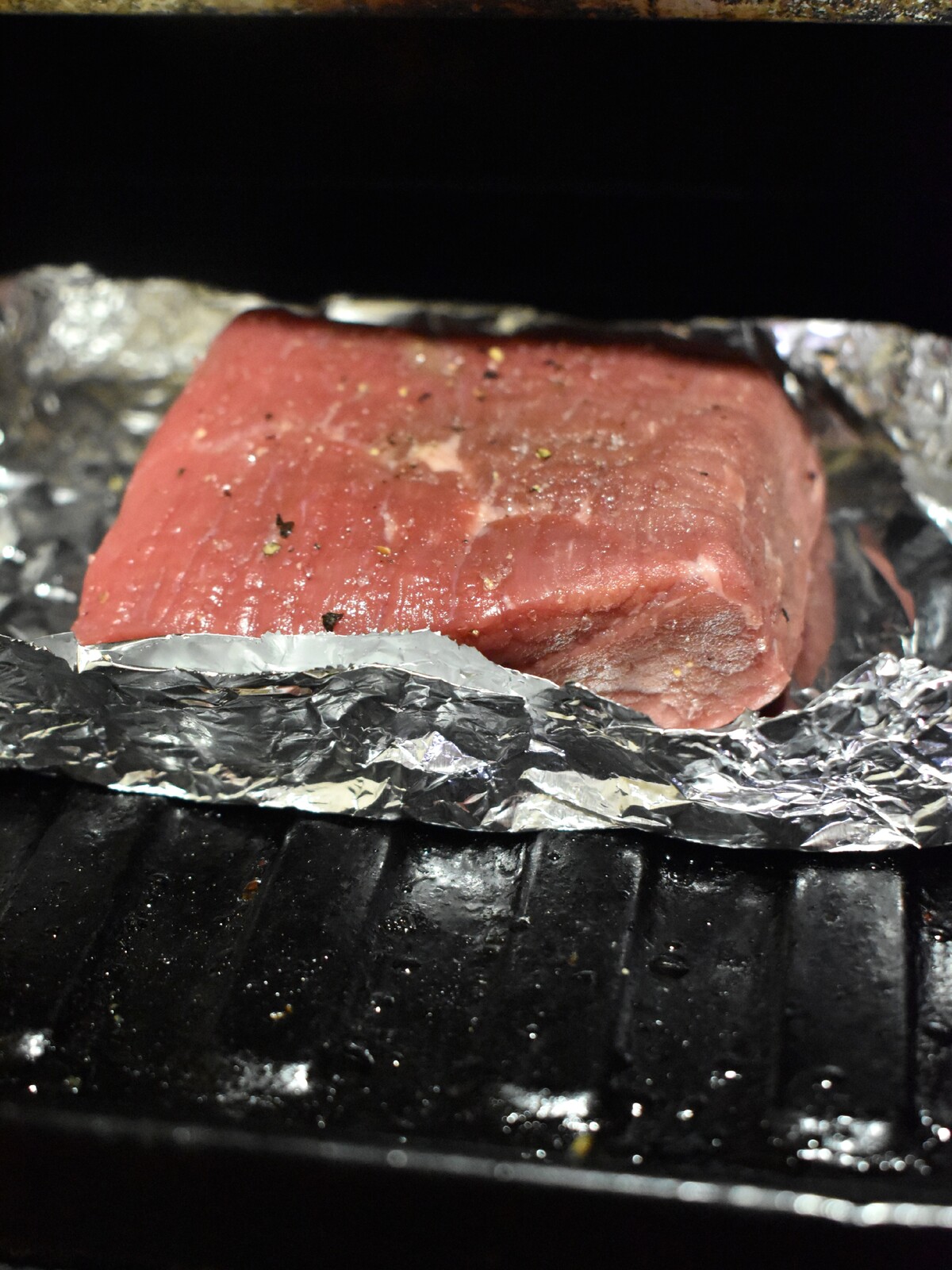 1.常温に戻した牛もも肉に【A】を擦りこんでアルミホイルにのせます