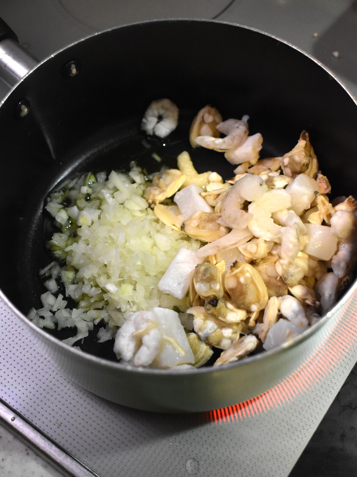 1.鍋にオリーブオイル、シーフードミックス、みじん切りにした玉ねぎを入れて炒めます