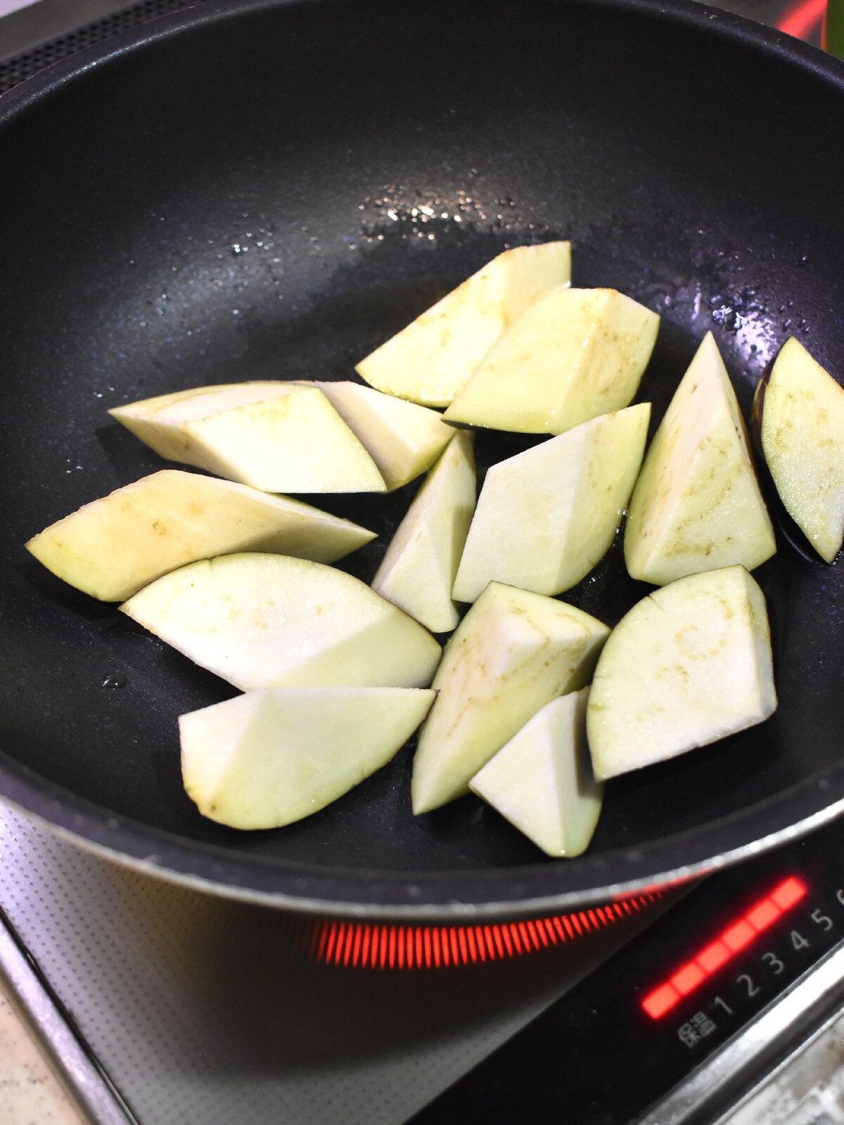 1.フライパンにごま油を入れて乱切りにした茄子を炒めます