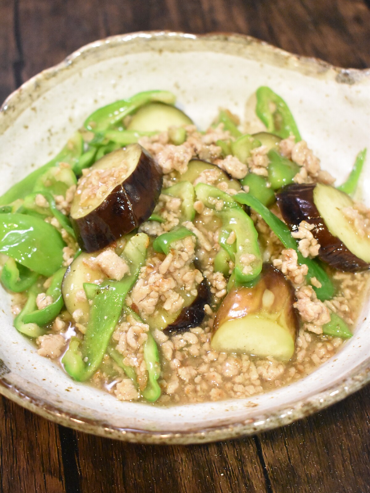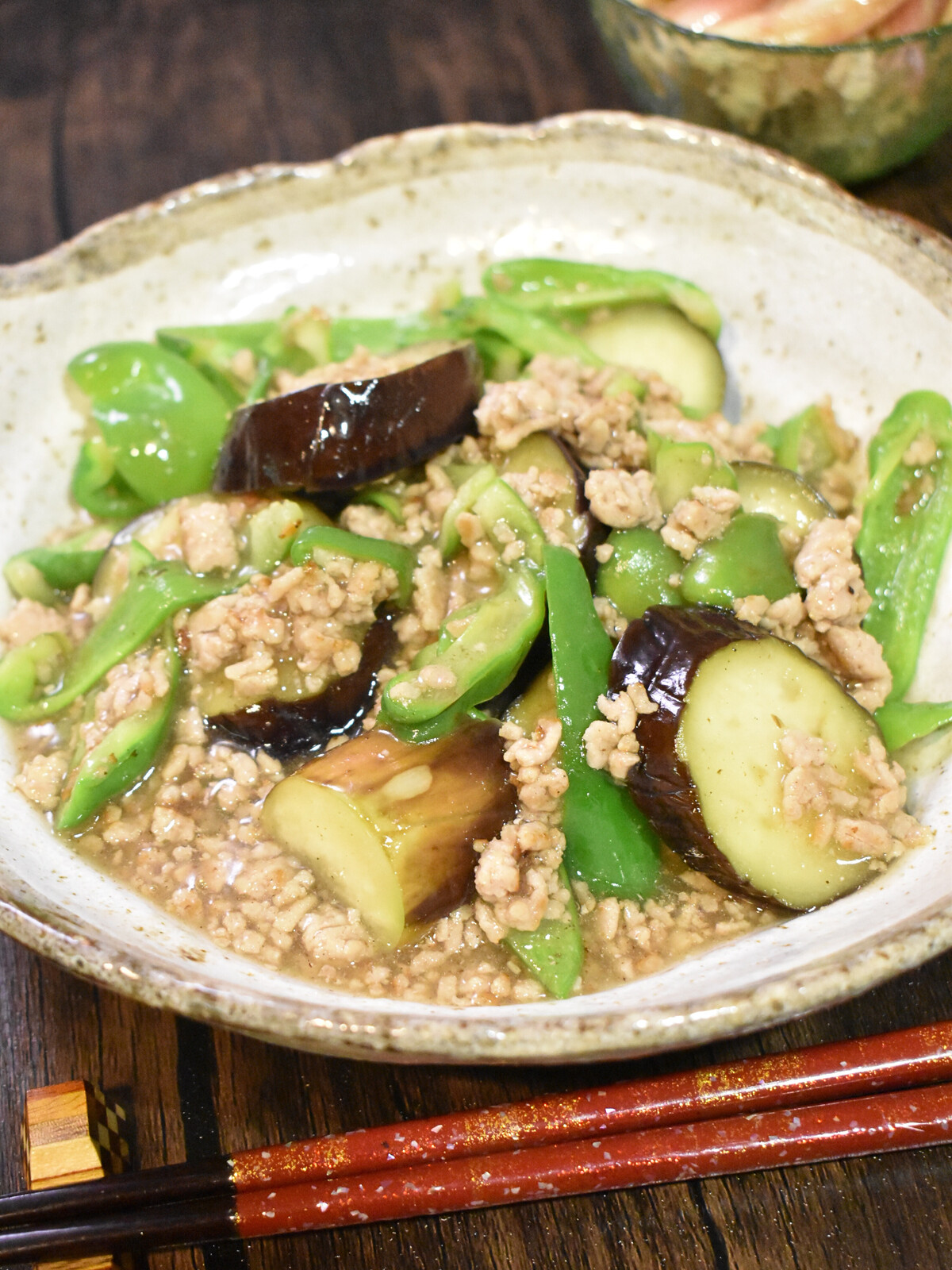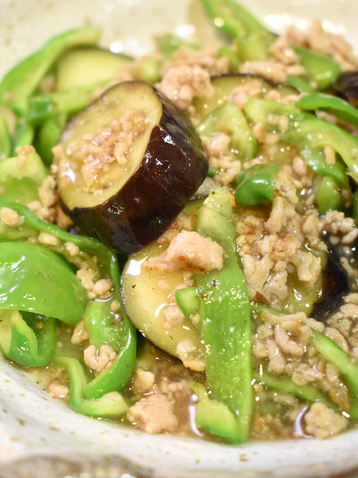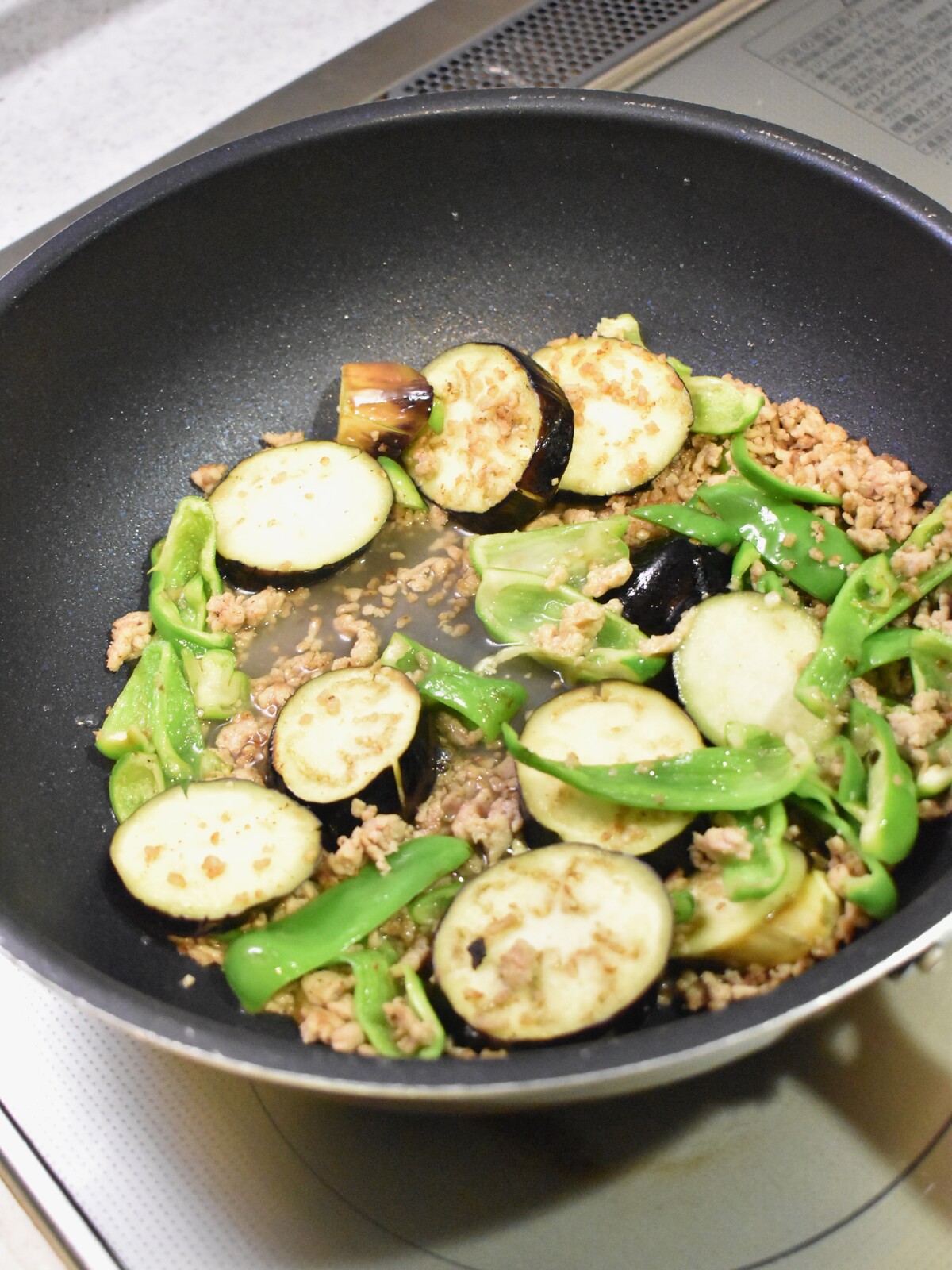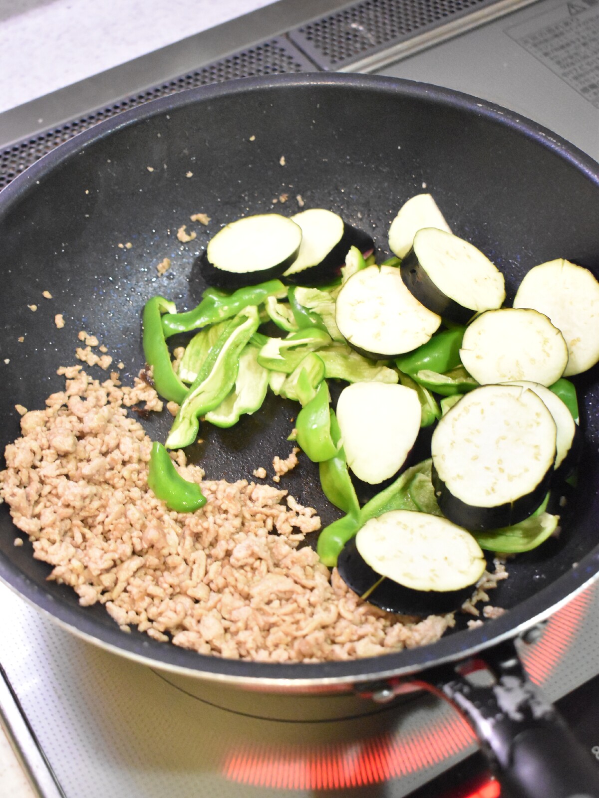 2.水分が飛んでパラパラになったらおろしにんにく、1㎝幅に切ったピーマンと茄子を入れます