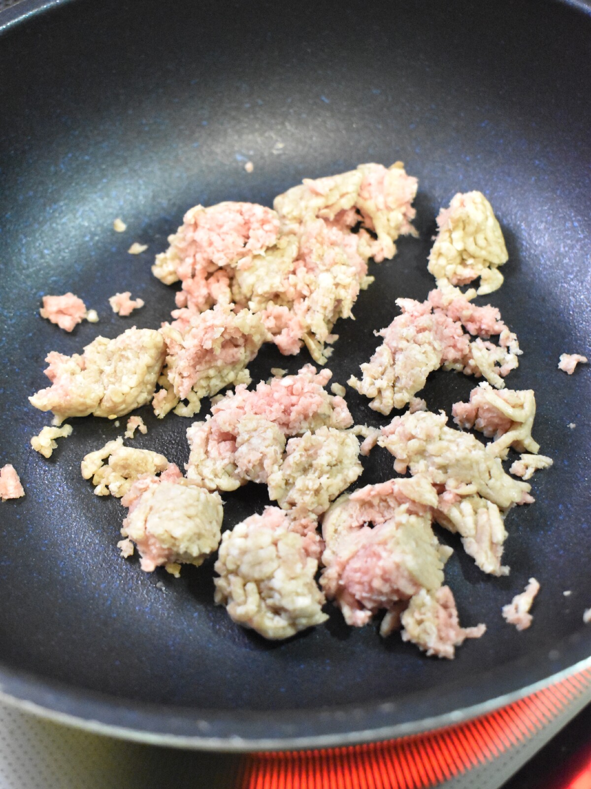 最初に豚ひき肉をしっかり炒めて臭みを飛ばします!