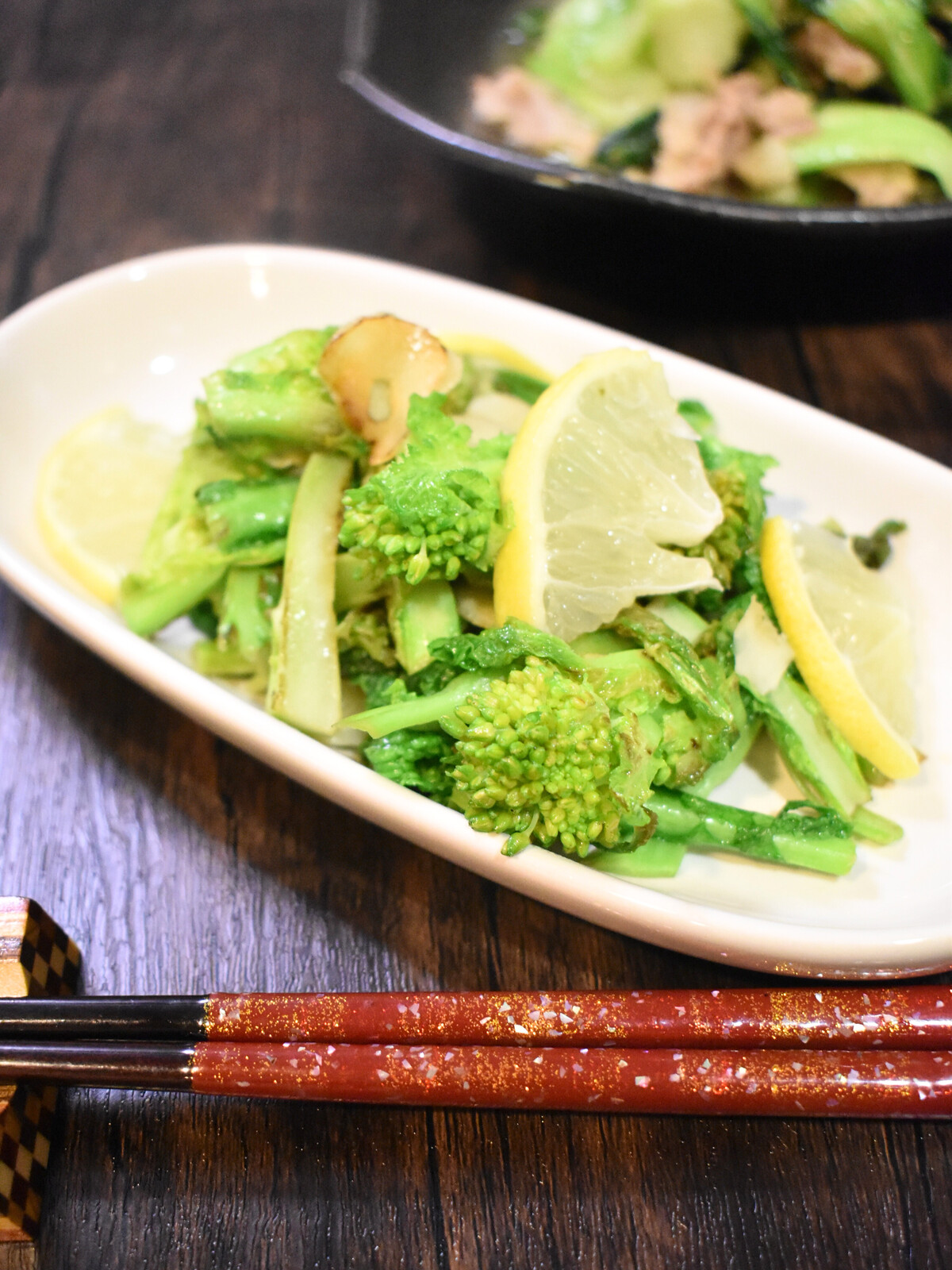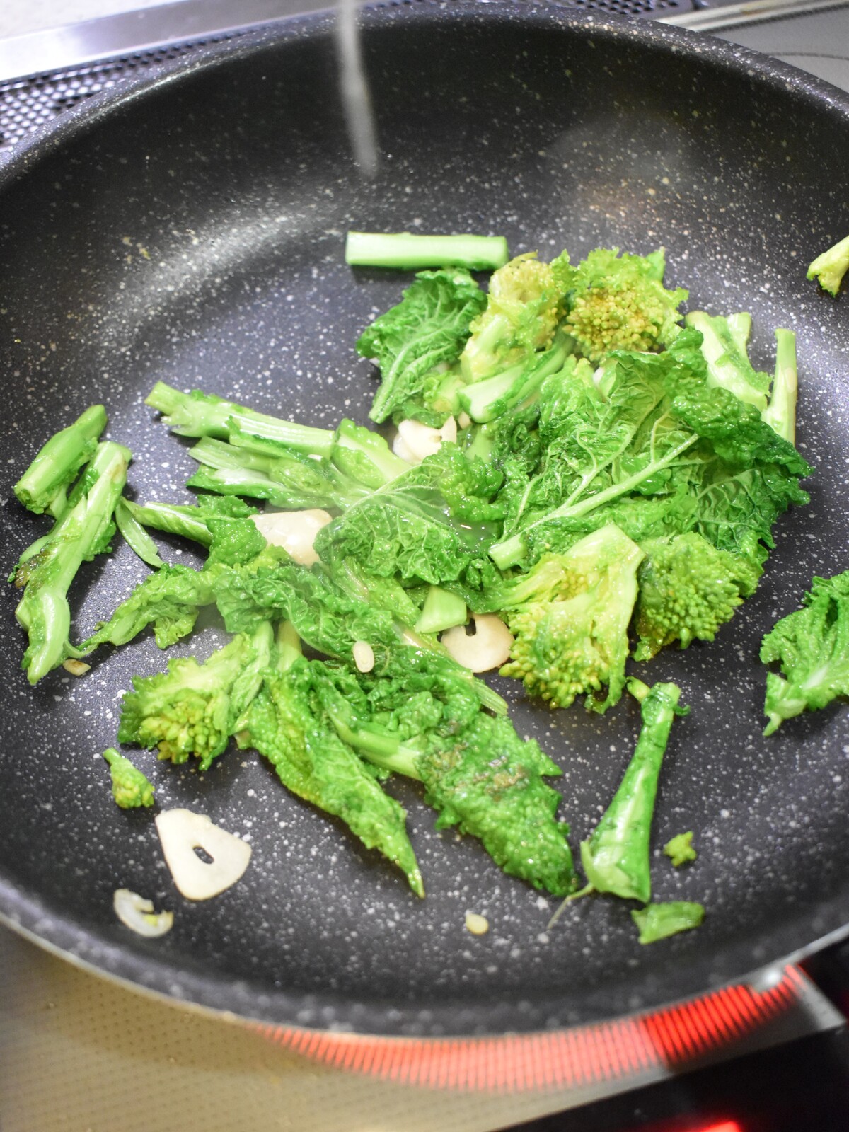 1.フライパンに食べやすく切った菜の花、薄切りにしたにんにく、【A】を入れます