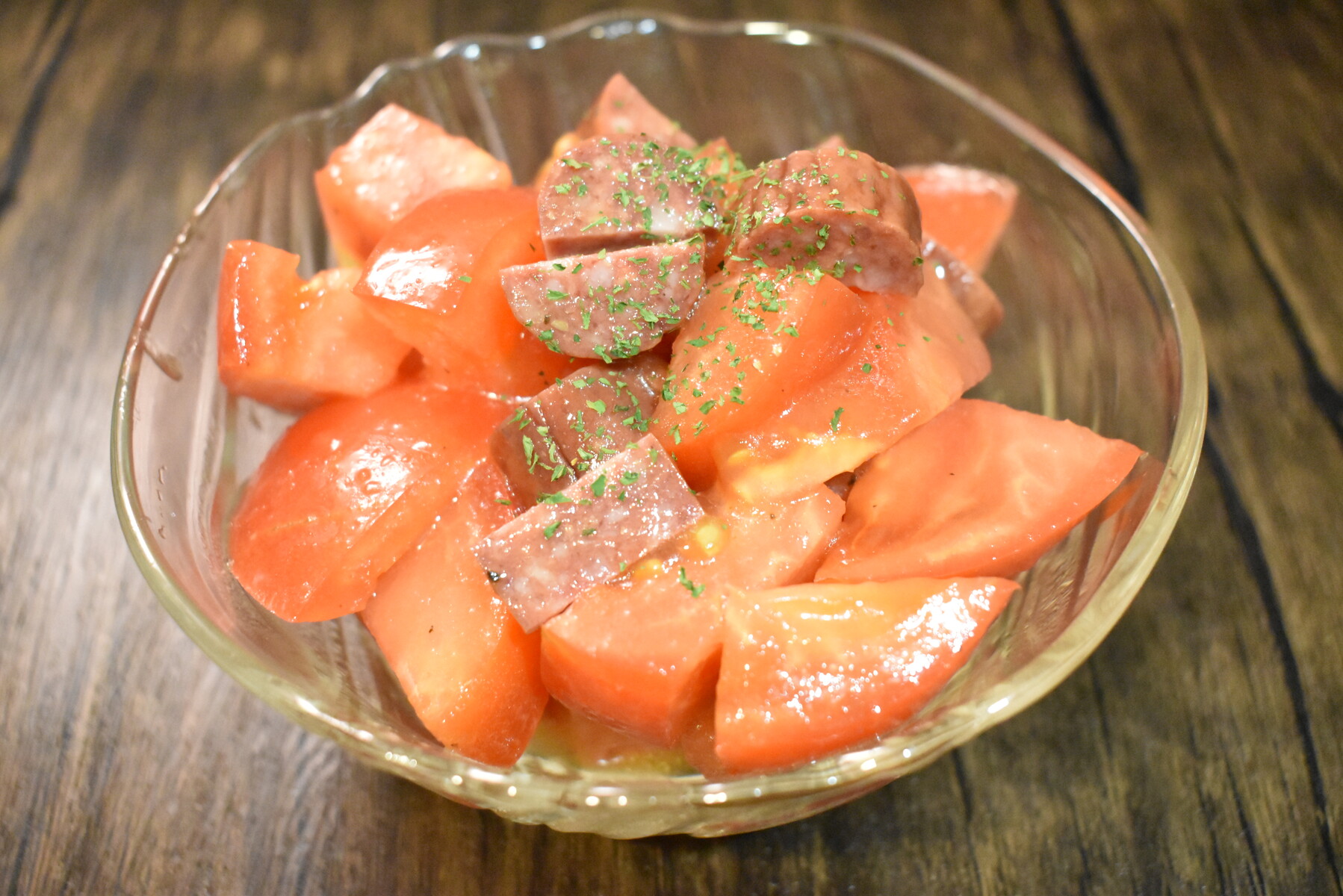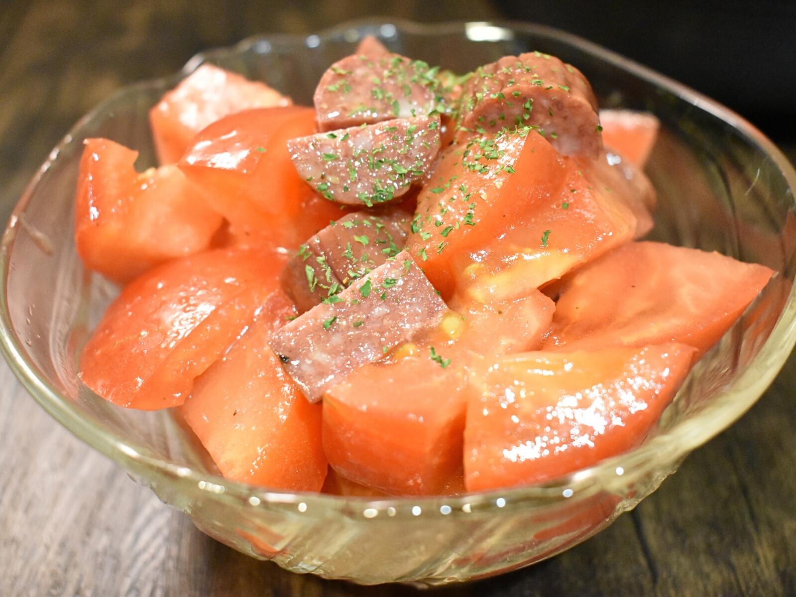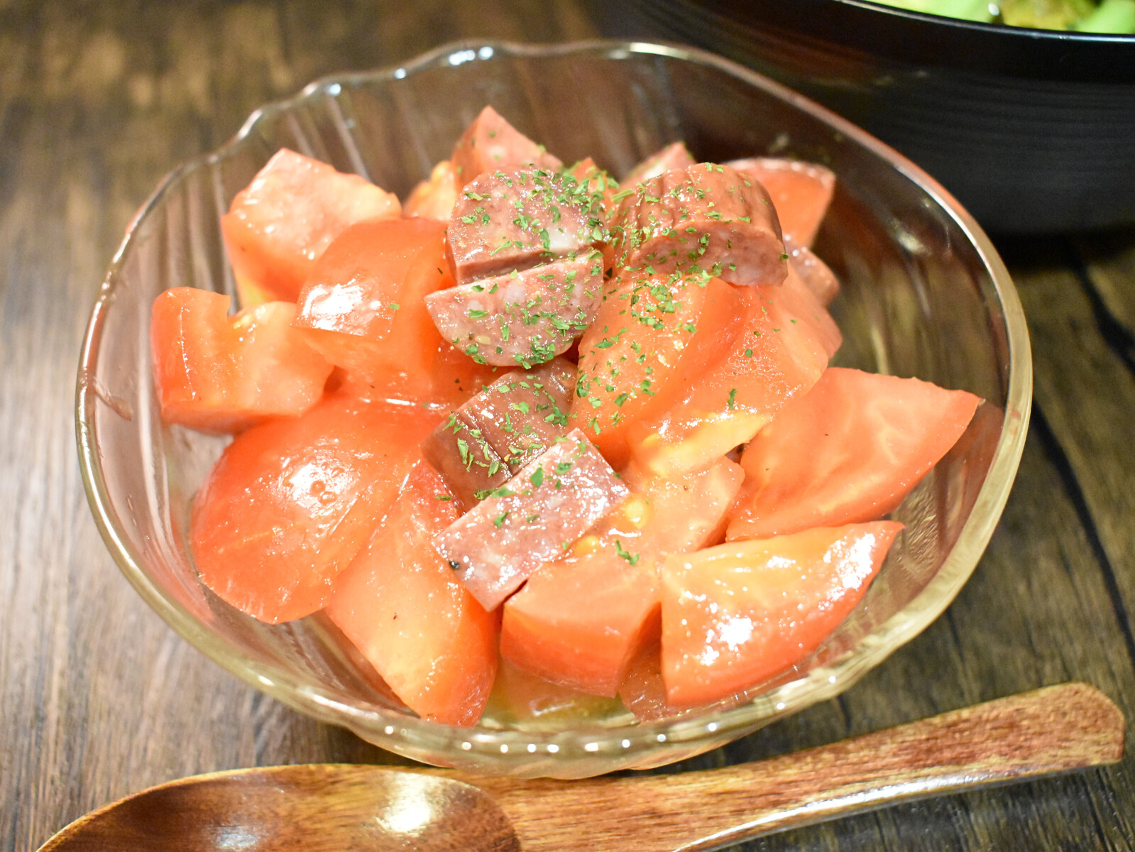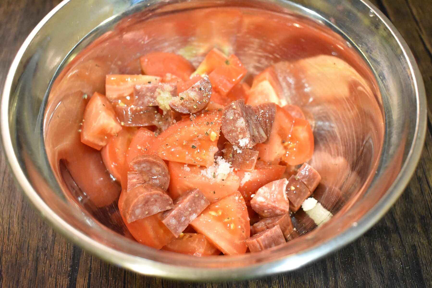 1.ボウルに3㎝角に切ったトマト、カルパス、【A】を入れます