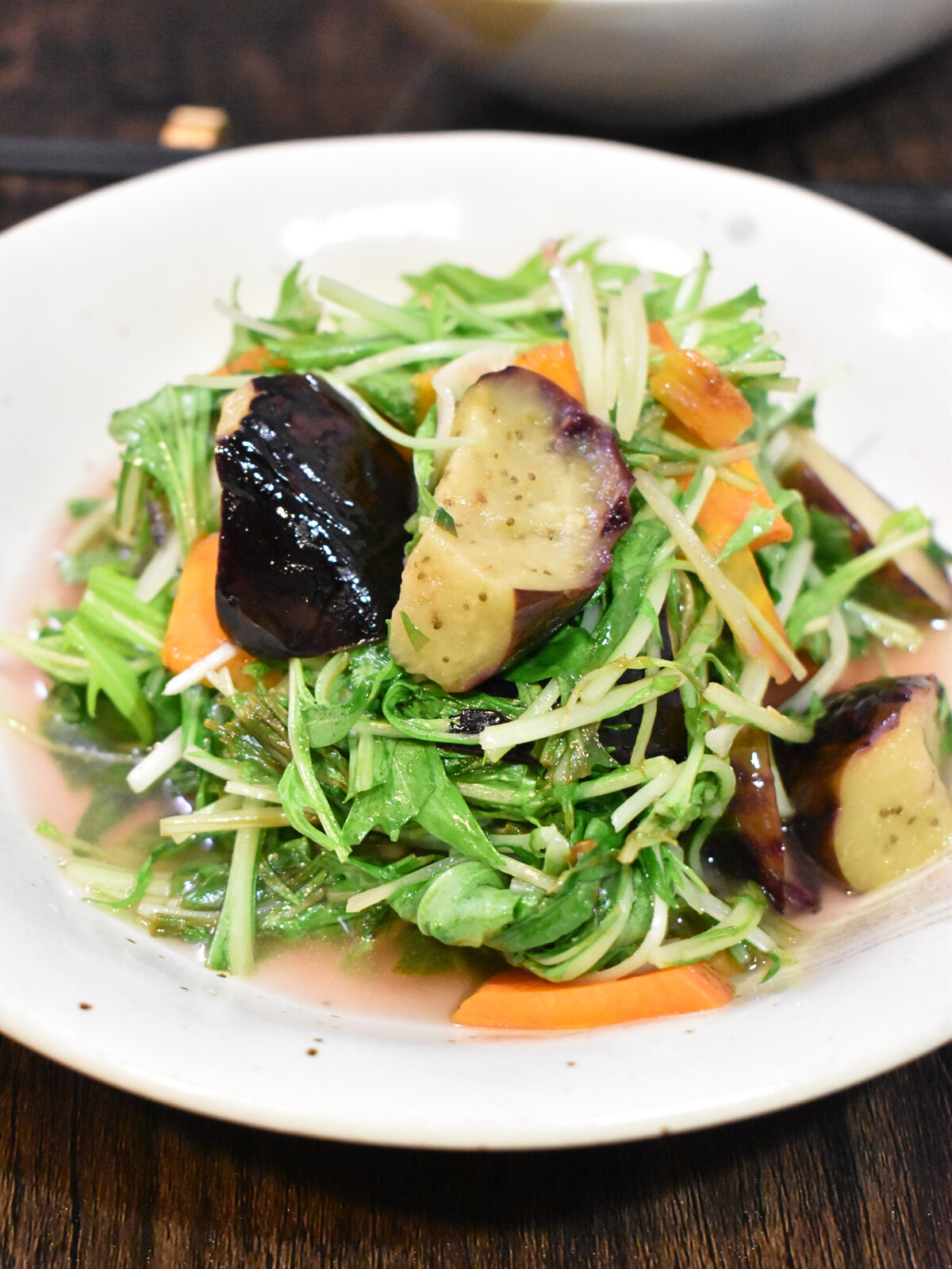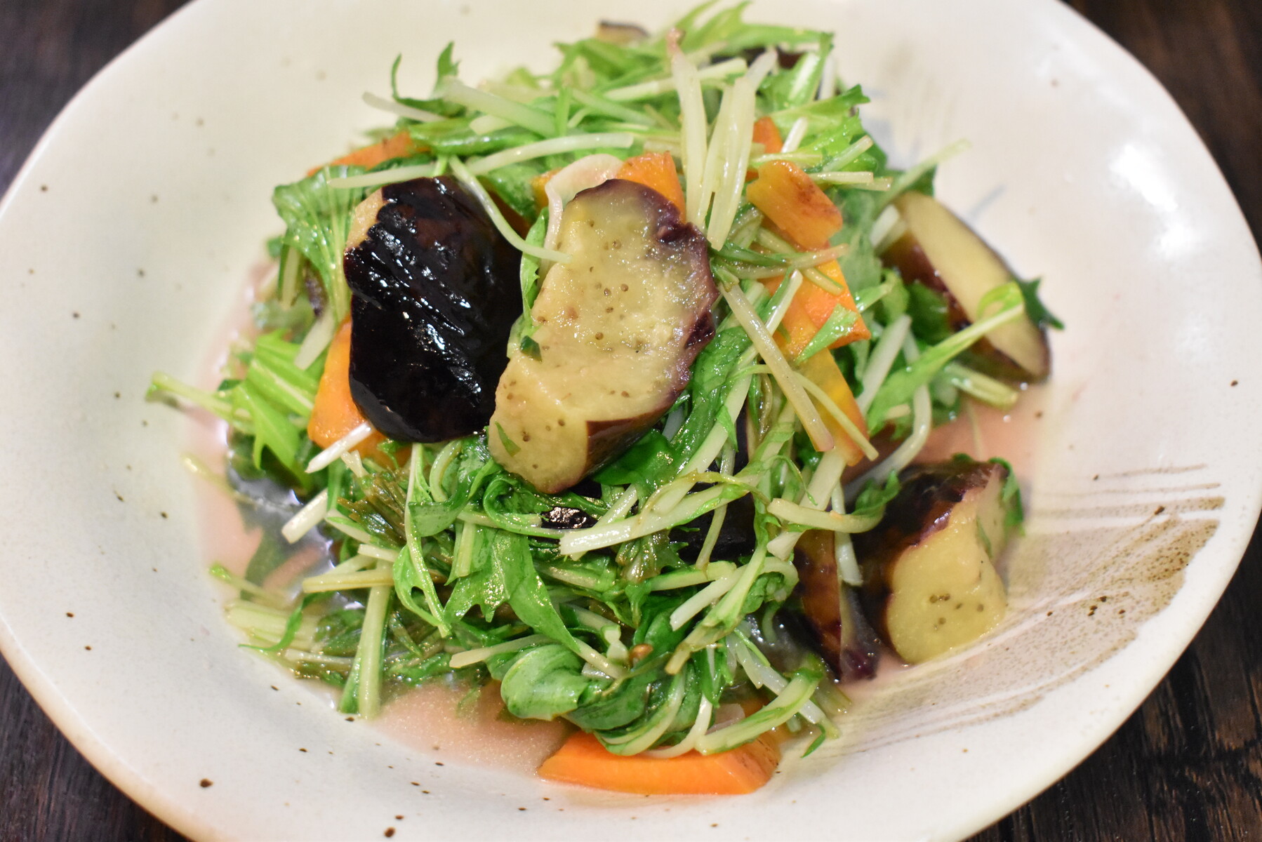 2.人参がしんなりとしたら4㎝幅に切った水菜、【A】を入れる